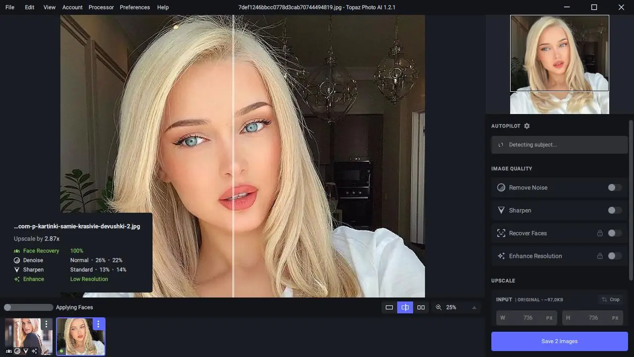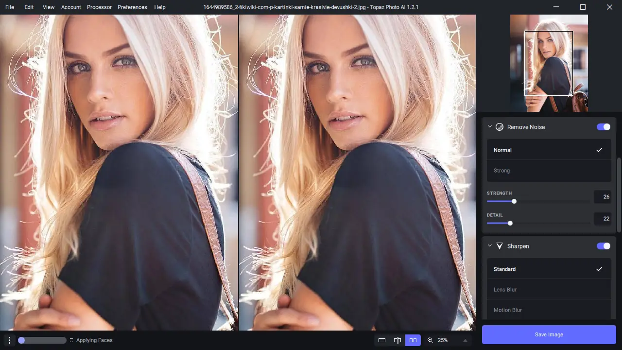 Topaz Photo AI — универсальный софт для обработки изображений, который помогает авторам и фотографам быстро и качественно улучшать свои фотографии. Объединив возможности Denoise AI, Sharpen AI и Gigapixel AI, эта программа значительно ускоряет рабочий процесс, позволяя сосредоточиться на творческом элементе. Интуитивный интерфейс и автоматические режимы дают возможность получать высококлассные результаты без необходимости глубоких знаний в редактировании.