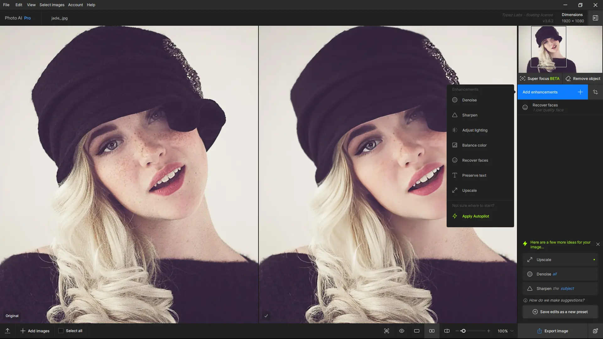 Topaz Photo AI представляет собой универсальное решение, которое сочетает в себе возможности нескольких популярных программных продуктов, таких как Denoise AI, Sharpen AI и Gigapixel AI. Такой подход позволяет получить максимально качественные изображения с меньшими затратами времени. Интуитивный интерфейс и автоматические функции Autopilot делают процесс редактирования легким и быстрым, а автоматическое применение оптимальных настроек обеспечивает высокое качество финального результата без необходимости глубокого ручного вмешательства.