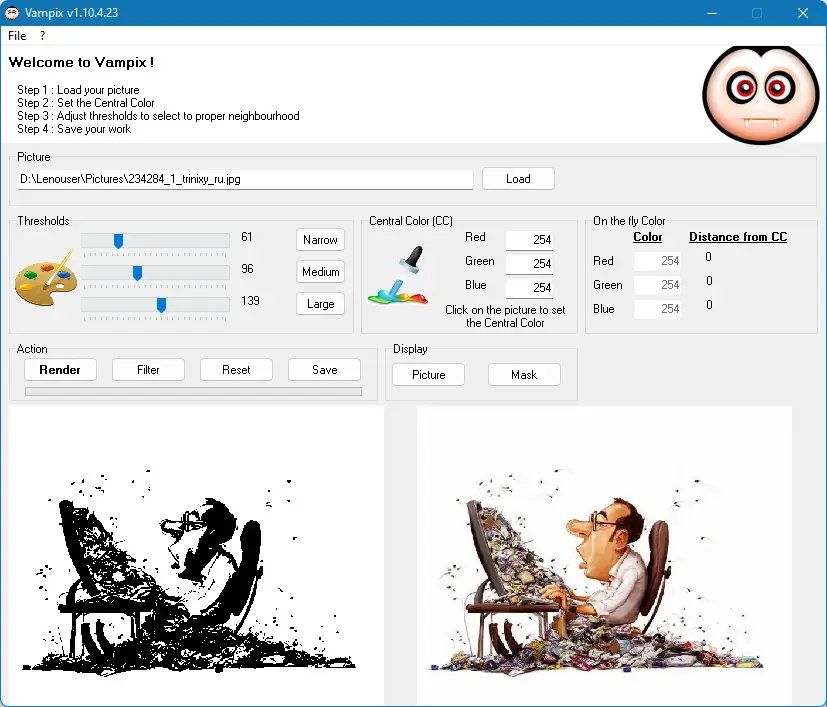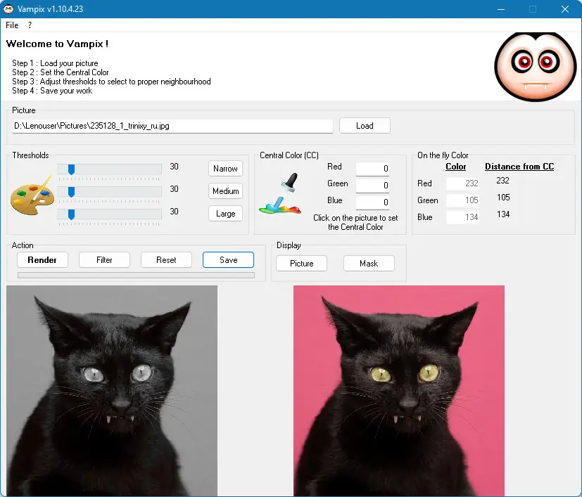 Vampix — это легкое и удобное приложение для редактирования изображений, которое позволяет быстро заменить основной цвет на выбранной фотографии или изображении. Программа ориентирована на минимальный интерфейс и понятную инструкцию, отображаемую прямо в окне, что делает её использование максимально простым. В процессе работы пользователь загружает нужное изображение, выбирает основной цвет и при необходимости применяет пресеты или настраивает масштабность эффекта с помощью ползунков. В режиме реального времени отображается предварительный просмотр изменений, что позволяет мгновенно оценить результат. Эта утилита особенно хорошо подходит для создания черно-белых фотографий с добавлением цветных акцентов, а также для выполнения быстрых цветовых коррекций.