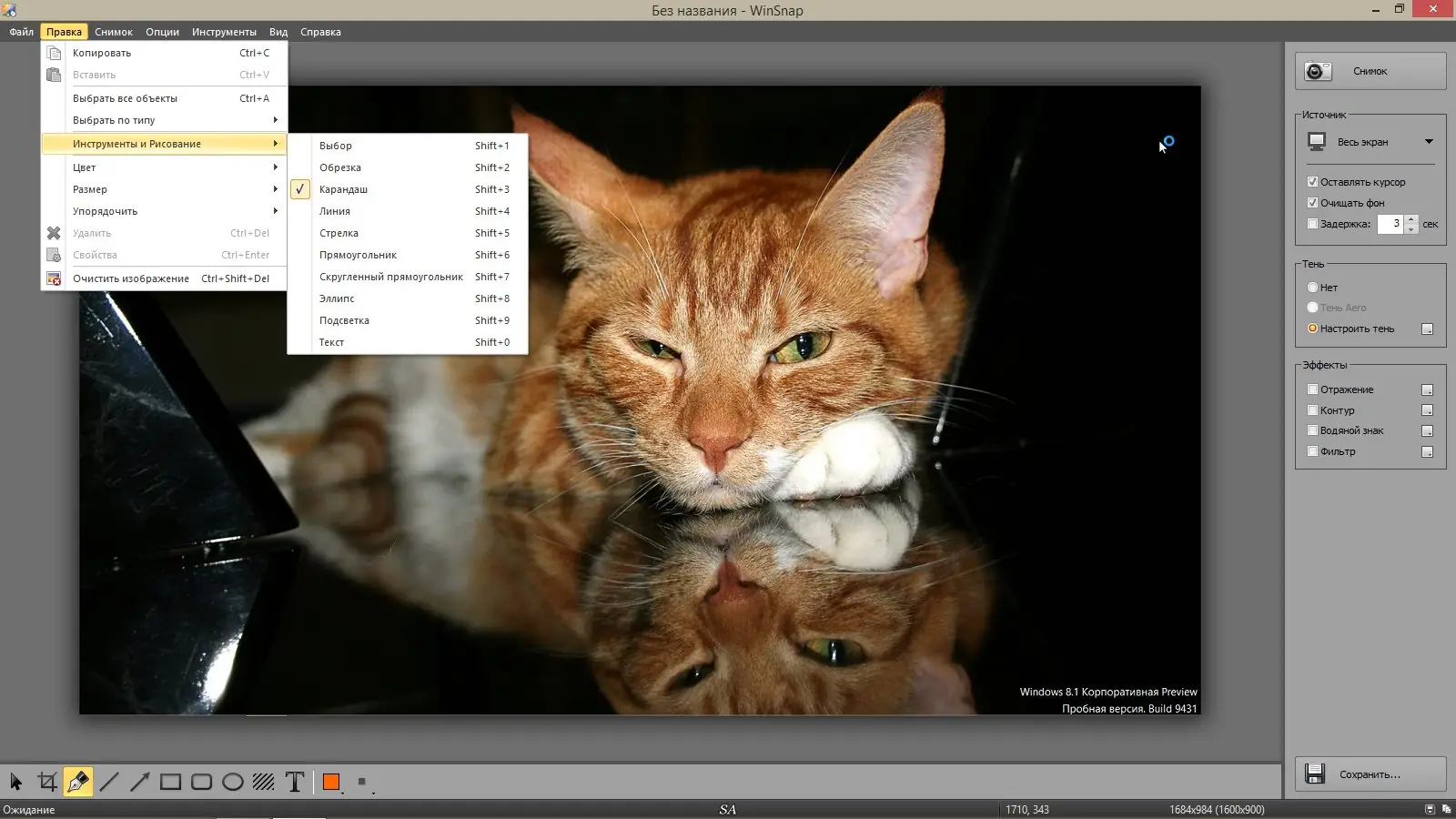 - Захват всего экрана, конкретных окон, объектов или выделенной области