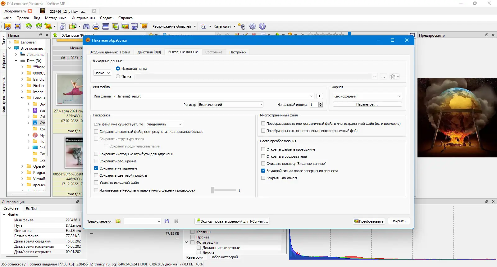 Преимущество XnViewMP — это универсальность и удобство интерфейса, выполненного в стиле проводника Windows. Она позволяет редактировать изображения, конвертировать их в разные форматы, создавать скриншоты, работать с метаданными EXIF, а также управлять большими коллекциями изображений в удобных каталогах. Помимо этого, программа обладает функциями пакетной обработки, поддерживает работу с анимациями и многостраничными файлами, что существенно ускоряет выполнение рутинных задач.