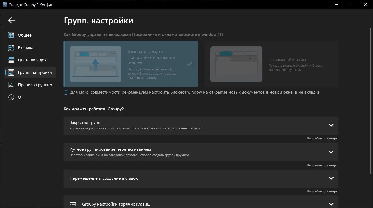 Stardock Groupy — мощная программа для организации рабочих окон, позволяющая группировать несколько запущенных приложений или документов вместе в одно окно с вкладками. Это обеспечивает более удобную работу и ускоряет доступ к необходимым файлам и инструментам, оптимизируя рабочий процесс.