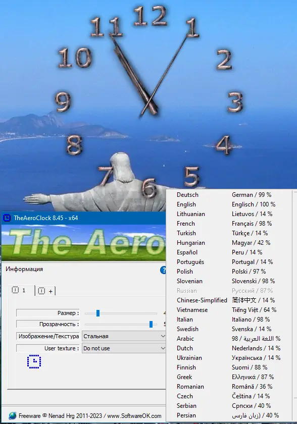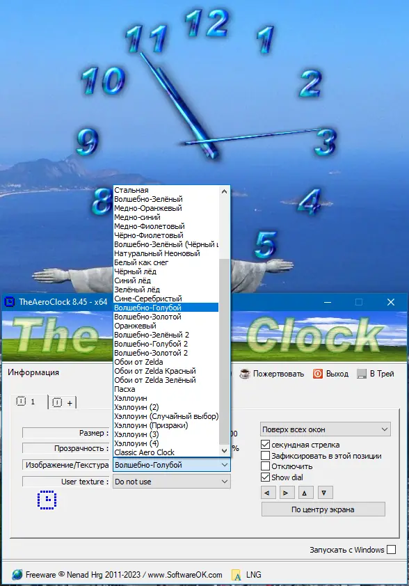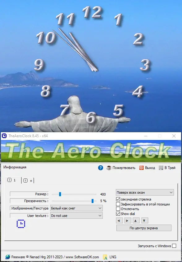 TheAeroClock — это удобный «виджет» для отображения времени, который легко настраивается под индивидуальные предпочтения пользователя. Он позволяет установить симпатичные часы на рабочий стол, регулировать их прозрачность, размеры, текстуры и расположение. Программа работает без необходимости установки — достаточно скачать и запустить файл, после чего часы будут отображаться поверх всех окон и запускаться вместе с системой. Благодаря расширенным настройкам, вы можете выбрать внешний вид циферблата, отключать или включать секундную стрелку, фиксировать положение часов, чтобы избежать случайных перемещений. Совместима с Windows 7, 8/8.1, 10 и 11 как на x32, так и на x64 Bit системах, что делает её универсальным инструментом для персонализации рабочего пространства.