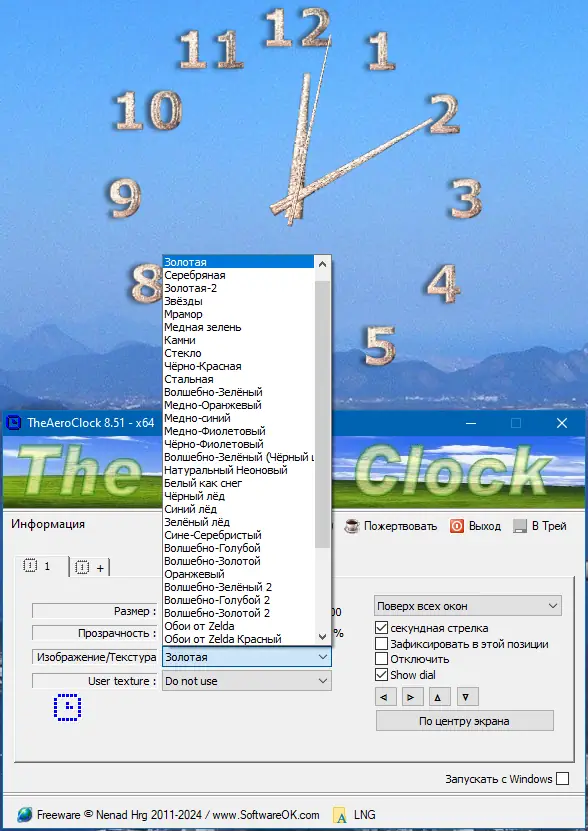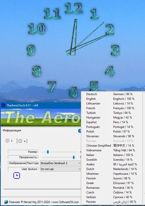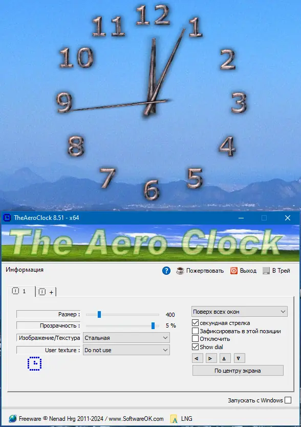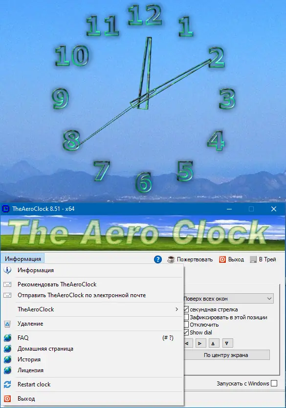 TheAeroClock – это портативное приложение, которое позволяет установить на ваш рабочий стол симпатичные часы с широкими возможностями настройки. Благодаря программе, вы сможете регулировать степень прозрачности, внешний вид, размер, положение и текстуру отображаемых часов. Удобно, что часы могут запускаться автоматически при включении системы и отображаться поверх всех открытых окон, не мешая вашей работе.