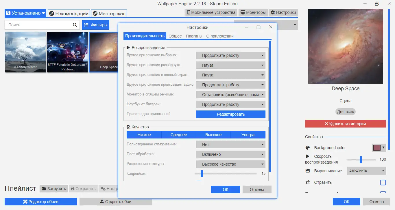- Поддержка Steam Workshop, что облегчает поиск и публикацию обоев.