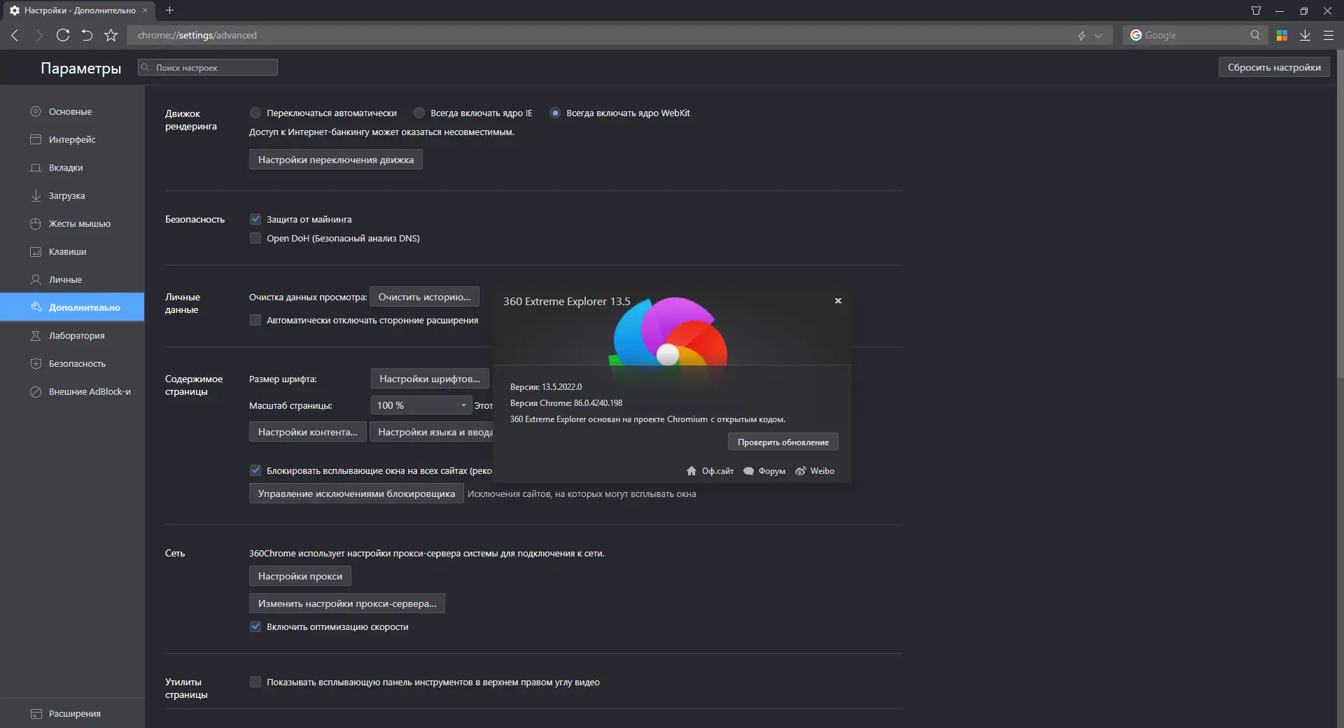 360 Extreme Explorer — это многофункциональный браузер, разработанный для обеспечения безопасного и удобного интернет-серфинга. Он сочетает в себе современные технологии и гибкую настройку, что делает его подходящим как для экспертов, так и для новых пользователей. Внешний дизайн легко настраивается, а часто посещаемые сайты отображаются в виде миниатюр на новой вкладке, что ускоряет доступ к нужной информации. Возможность переключения между движками Webkit и Internet Explorer обеспечивает совместимость и высокую производительность, а автоматический выбор движка делает работу ещё проще и комфортнее.