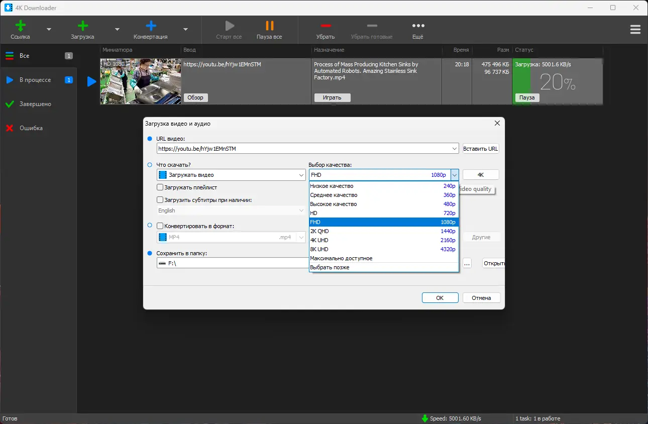 - Преобразование видео в аудио только формат или выбор качества загрузки