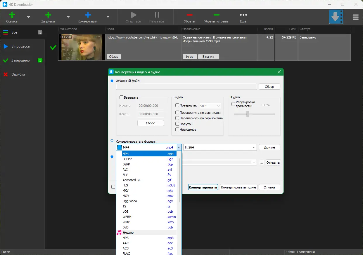 - Возможность скачивания только аудио или преобразования видео в нужный формат