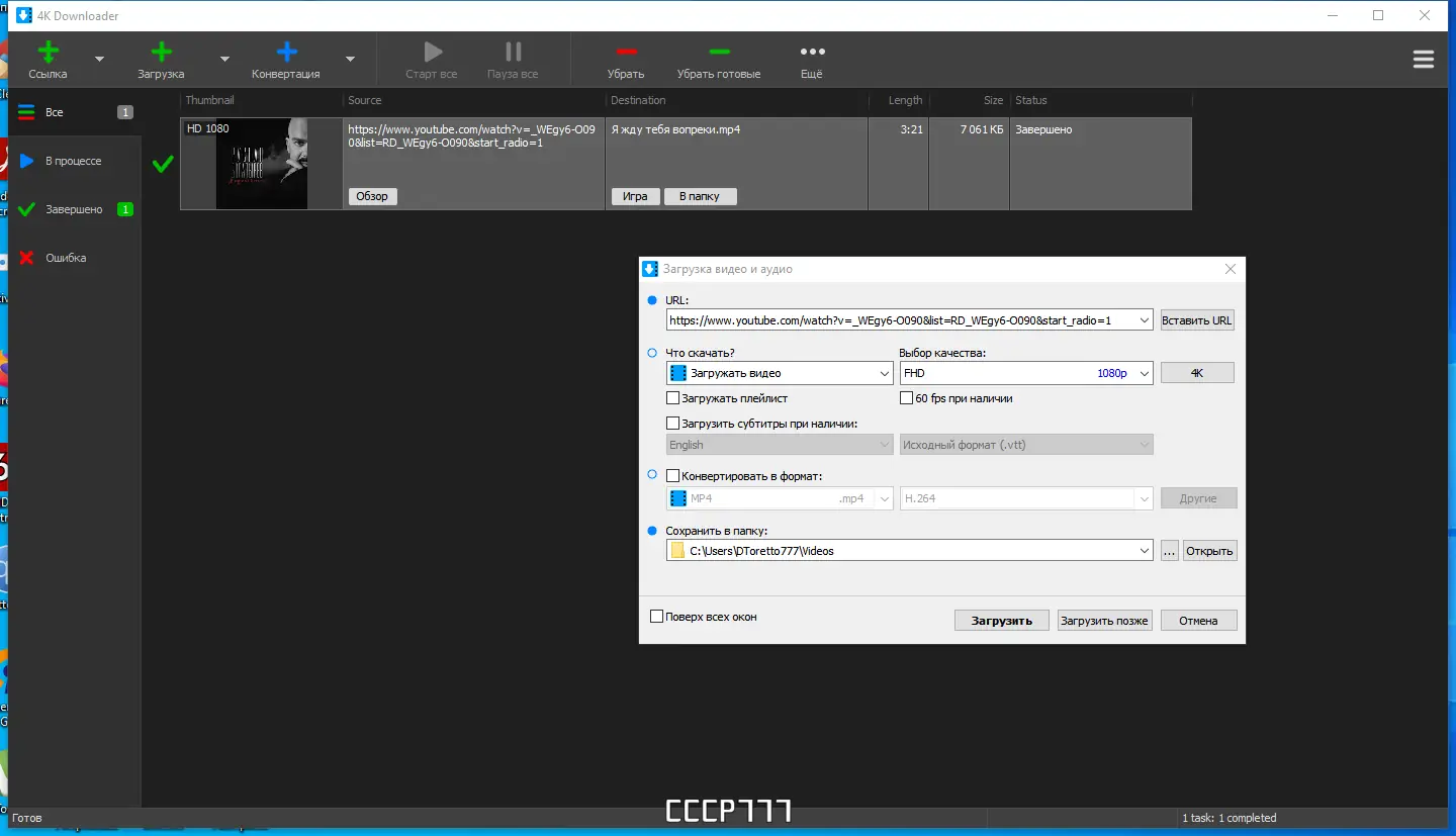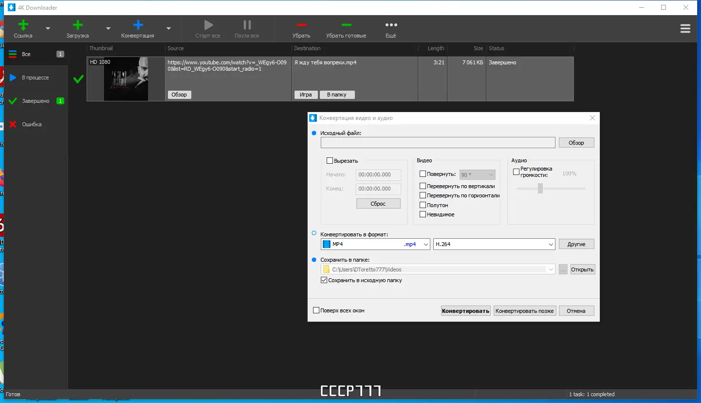 - Выбор качества и формата файла, а также возможность преобразования видео