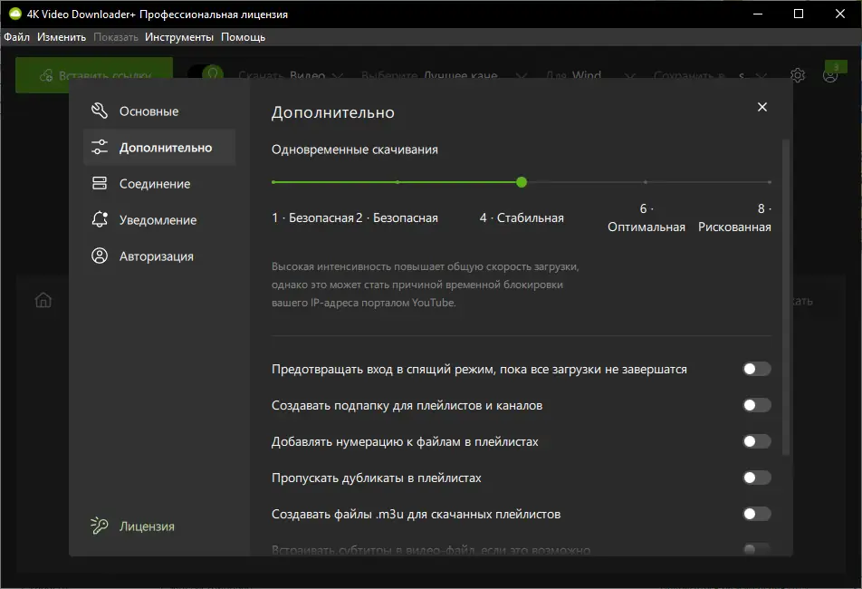 - Автоматическое скачивание новых видео с подписанных каналов и настройка скорости скачивания и потоков в настройках.
