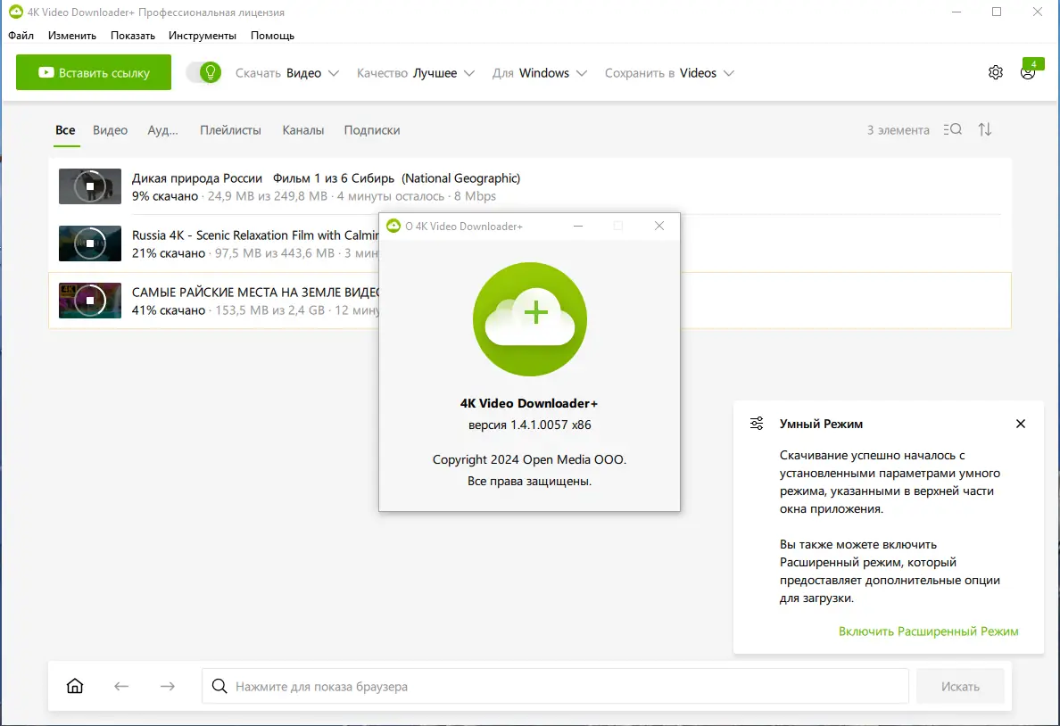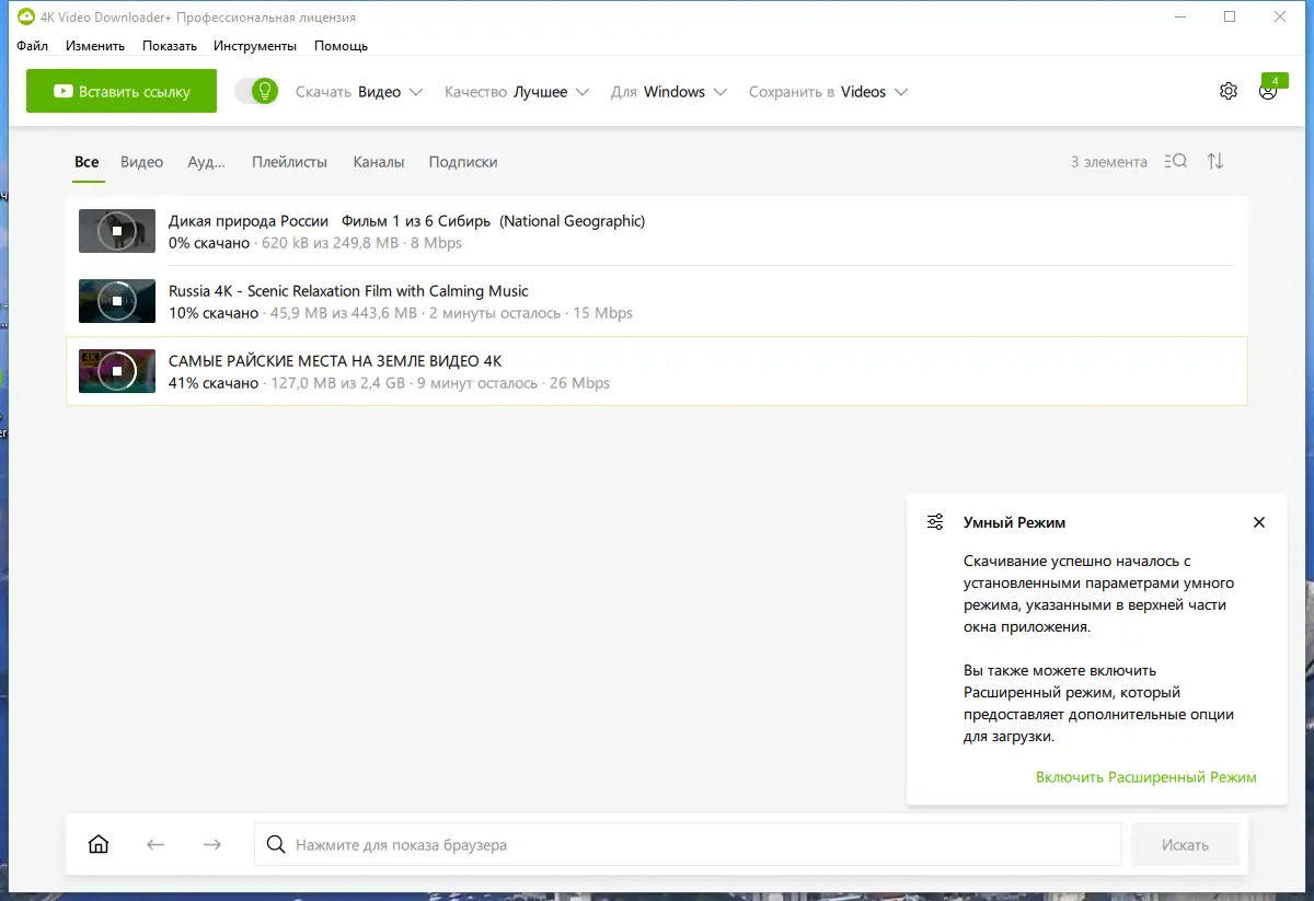 - Умный режим для автоматизации и ускорения процесса скачивания.