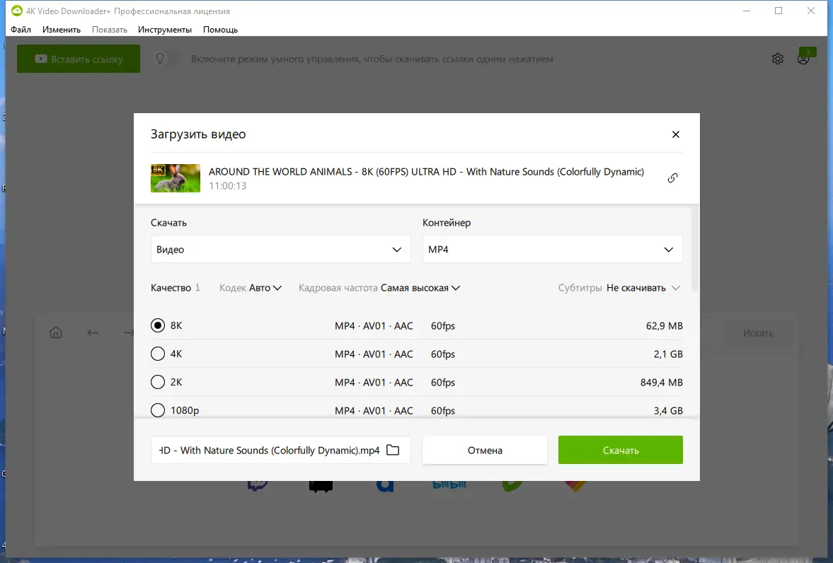 - Поддержка скачивания видео в 4K и 8K разрешениях.