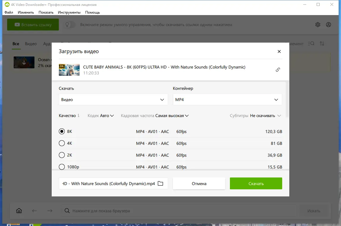 4K Video Downloader — небольшая, но мощная программа для скачивания мультимедийных файлов с YouTube и других популярных сервисов, таких как Vimeo, Facebook, DailyMotion и др. Она позволяет сохранять видео в самом высоком разрешении, включая 4K и 8K, а также загружать целые плейлисты и каналы. Благодаря интуитивному интерфейсу и трем основным кнопкам — вставки URL, «умного» режима и помощи — работать с программой легко и приятно. Возможна загрузка субтитров, аудио без видео и 3D-контента. Также предусмотрена поддержка 360° видео и настройка прокси-серверов для обхода ограничений региона.