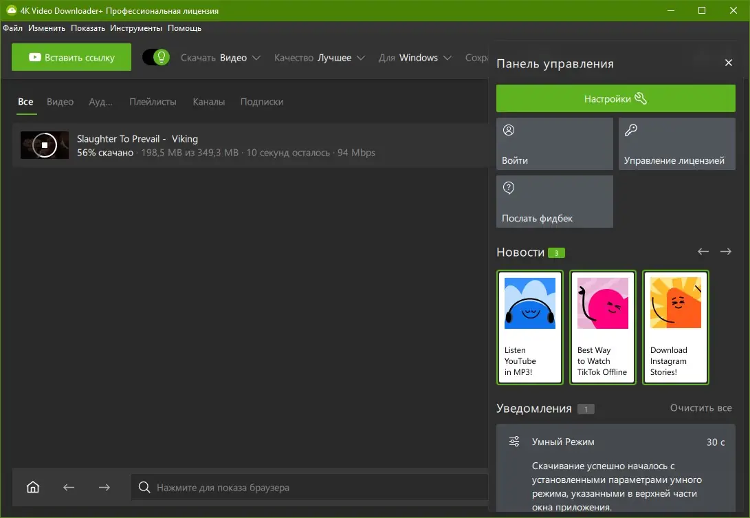 Интуитивный ряд настроек, включая выбор потока, скорости скачивания и прокси-сервера, обеспечивает гибкое управление процессом. Встроенный режим «Умный режим» позволяет автоматизировать скачивание, задав предпочтительные параметры для всех будущих ссылок, что существенно ускоряет обработку больших объемов материалов.