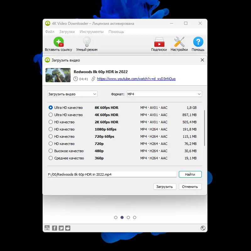 - Поддержка скачивания видео в 4K и 8K разрешениях.