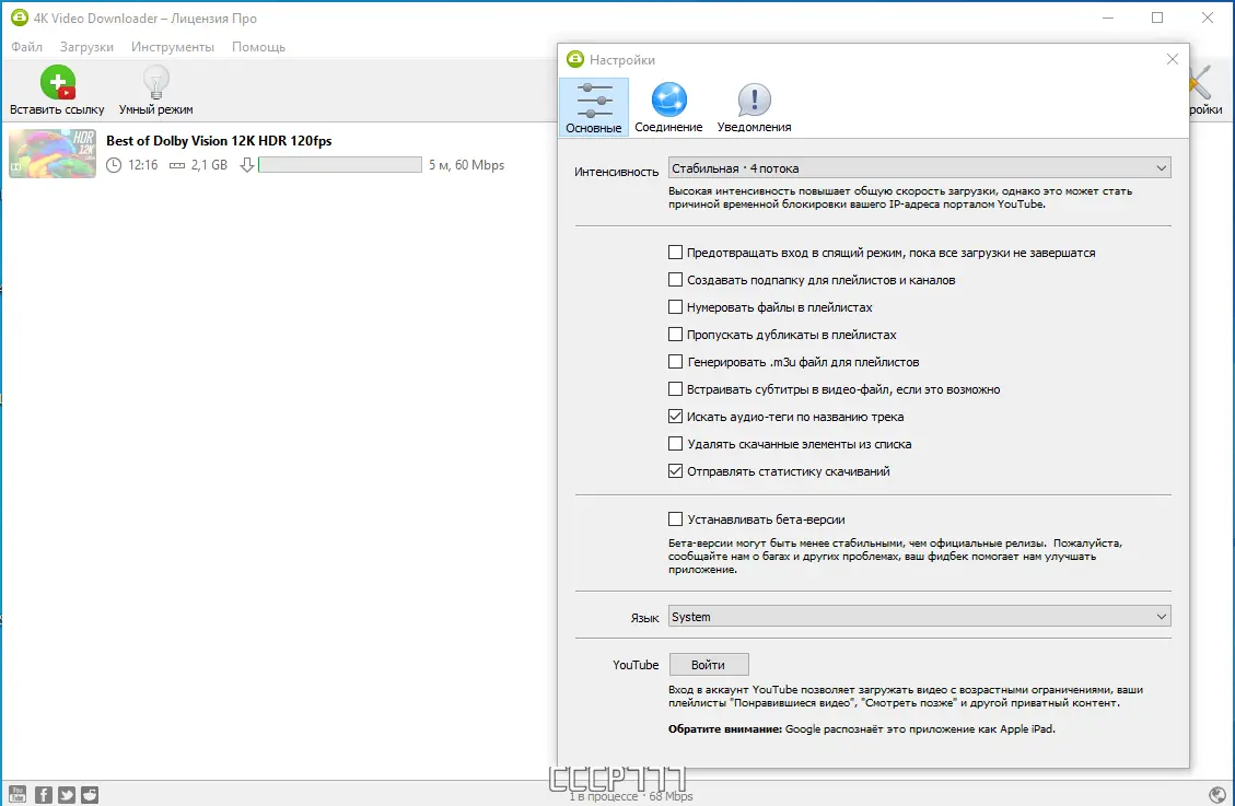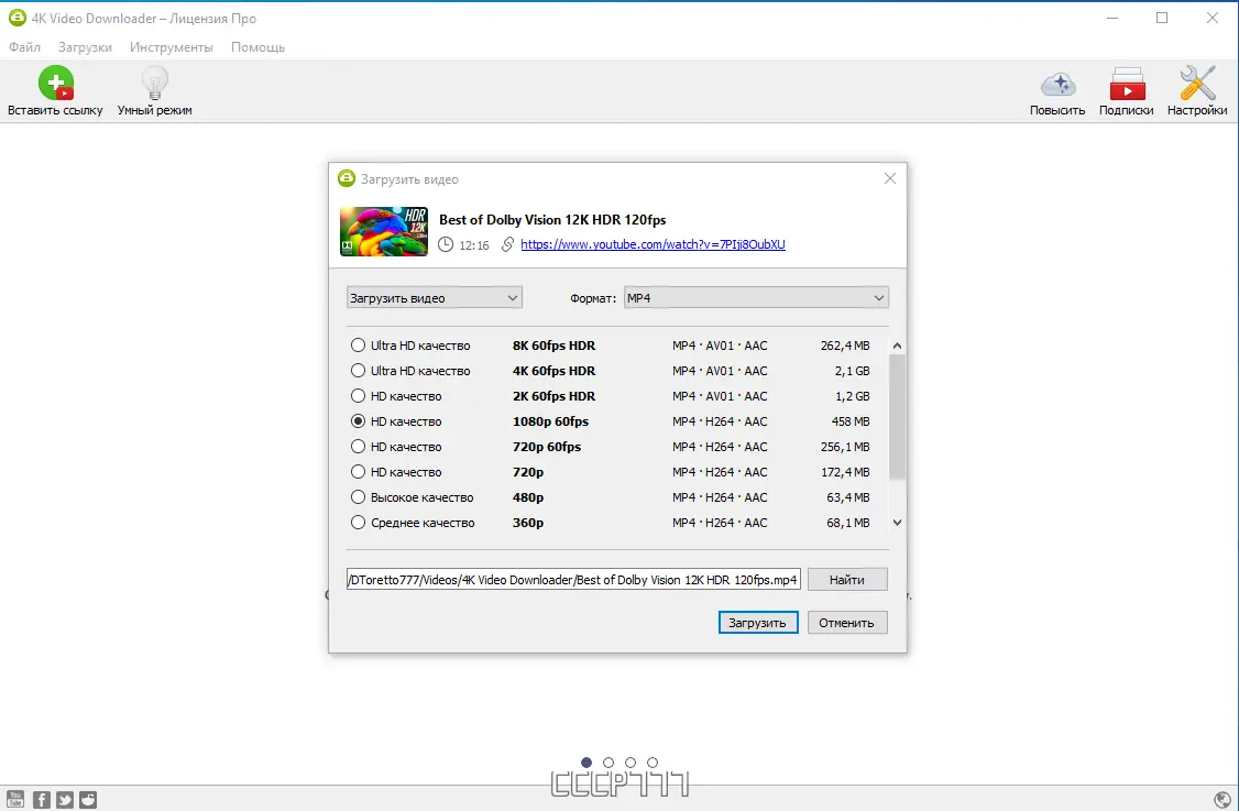 - Загрузка видео в 4К, HD 1080p и HD 720p, а также возможность скачивания 8K роликов.