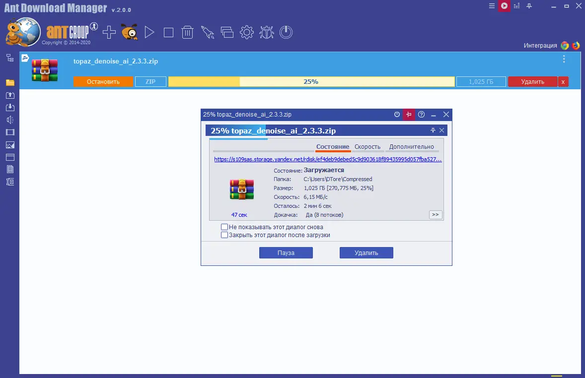 Ant Download Manager — это современное решение для скачивания любых файлов из сети. Он отлично справляется с загрузкой видео с популярных видеосервисов, таких как YouTube, Vimeo, DailyMotion, а также с любых других ресурсов через поддерживаемые протоколы HTTP, HTTPS и FTP. Программа интегрируется в браузеры, включая Internet Explorer 8+, Mozilla Firefox 32+ и Google Chrome 31+, что обеспечивает удобство и скорость работы. Использование технологии многопоточности позволяет загружать файлы значительно быстрее, а также восстанавливать прерванные загрузки при сбоях интернета. Простая и понятная навигация делает этот инструмент идеальным как для опытных пользователей, так и для новичков.