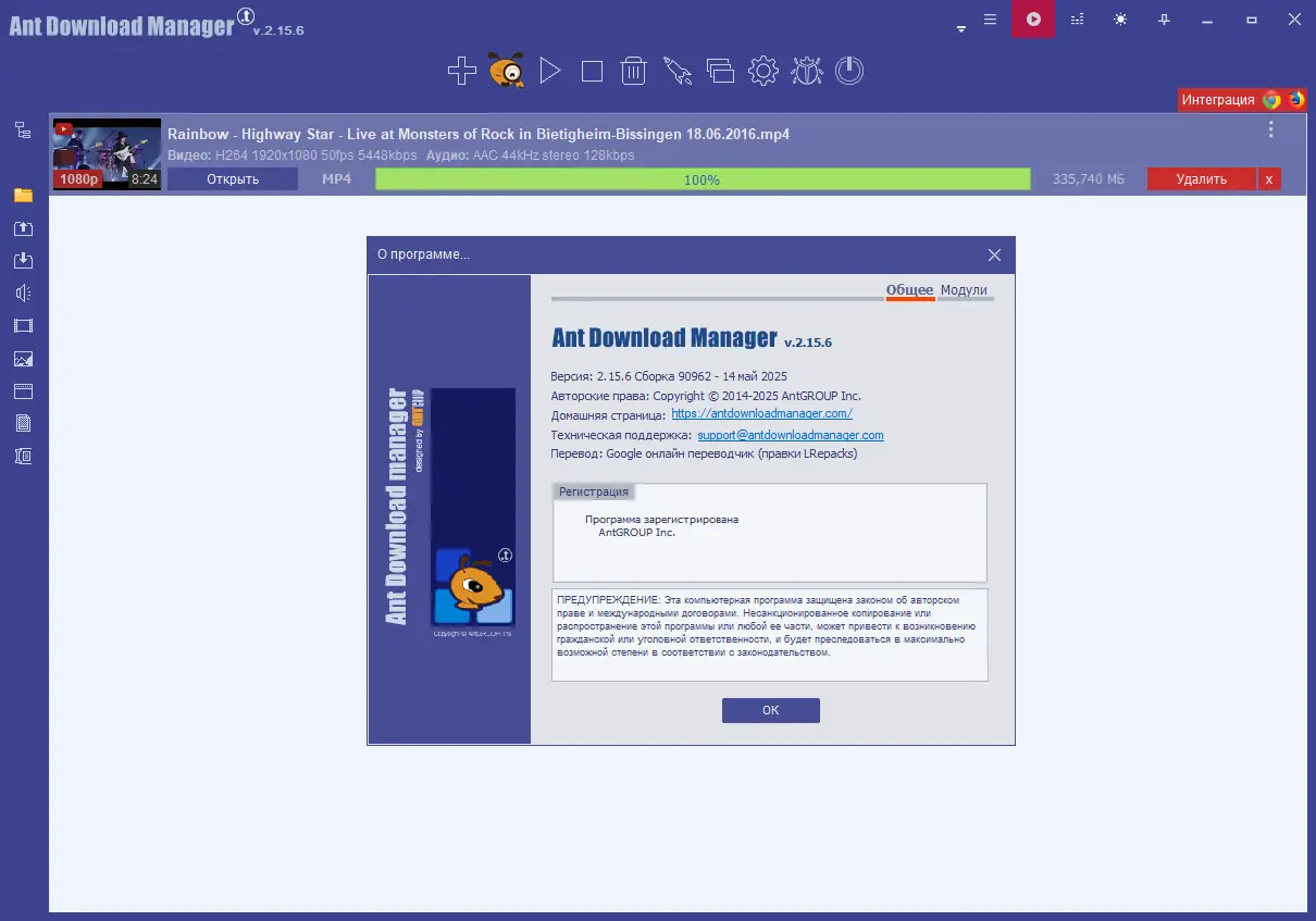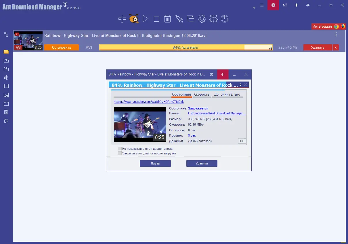 Ant Download Manager — это универсальный инструмент для эффективного скачивания файлов, видео и аудио контента. Благодаря многопоточности и встроенной автоматизации, он значительно увеличивает скорость загрузки, что особенно актуально при работе с крупными файлами или объемным медиаконтентом. Программа автоматически восстанавливается после временных сетевых ошибок, поддерживает возобновление прерванных загрузок и позволяет планировать задачи загрузки на удобное время. Интерфейс выполнен в дружелюбном стиле, предусматривает разделение загрузок по категориям, работу с очередями и настройку приоритетов. Также AntDM обладает расширенными функциями по захвату видео с популярных видеосервисов, извлечению звуковых дорожек и их конвертации в MP3, интеграцией с браузерами и поддержкой различных сетевых протоколов.
