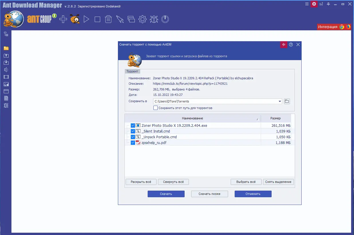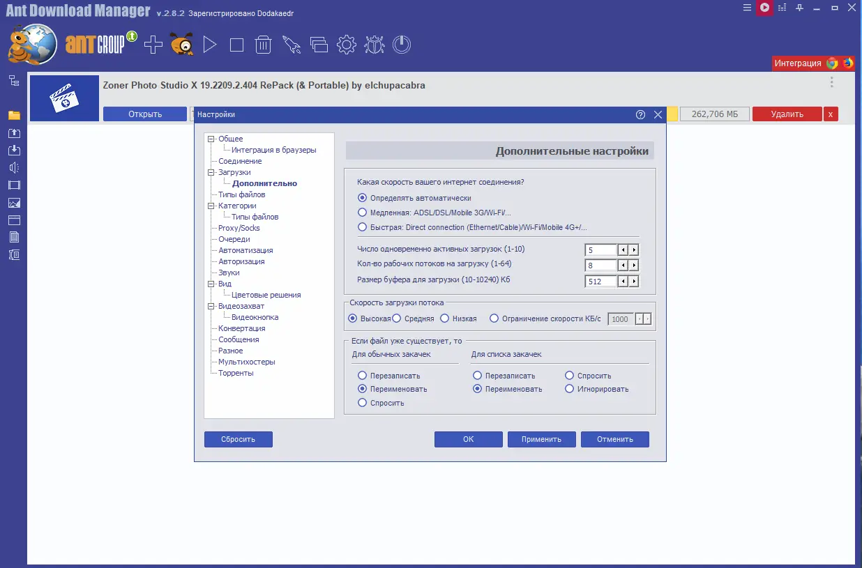 Ant Download Manager — это мощный менеджер загрузки, который значительно облегчает процесс скачивания файлов с любых ресурсов. Он хорошо интегрируется со всеми популярными браузерами, такими как Google Chrome, Яндекс.Браузер, Opera и Mozilla Firefox, а также поддерживает загрузку с защищенных сайтов (HTTPS) и FTP-серверов. Приложение подходит для Windows 7, 8/8.1, 10 и 11, работает в архитектуре x32 и x64 Bit, предоставляя пользователю удобный интерфейс для управления загрузками.