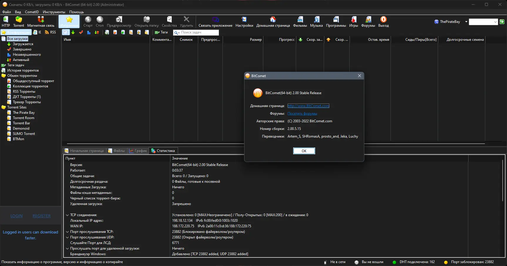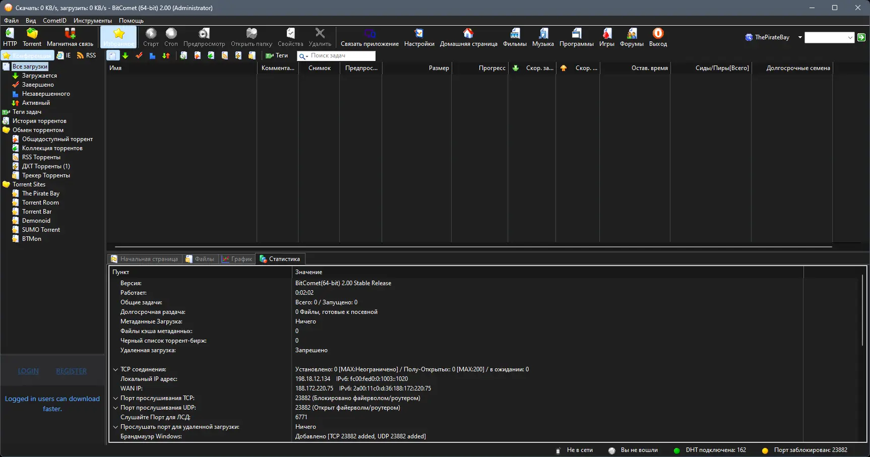 BitComet — это мощный и простой в освоении клиент для работы с торрентами, который позволяет скачивать файлы через протокол Bittorrent. Программа поддерживает одновременную загрузку нескольких файлов с установлением приоритета, создание очередей загрузки и бысткое управление процессом скачивания. Она работает с любыми соединениями, включая через прокси-серверы, и автоматически снижает скорость отдачи для повышения скорости загрузки. Благодаря встроенной автоматической настройке соединений и поддержке дополнительных технологий, обеспечивается оптимальная производительность на различных устройствах и сетевых условиях. BitComet способен распознавать Magnet-ссылки, обеспечивает просмотр видеофайлов во время загрузки и предоставляет подробную статистику по закачкам. Также программа поддерживает работу портативной версии, что позволяет использовать её без установки на любой ПК.
