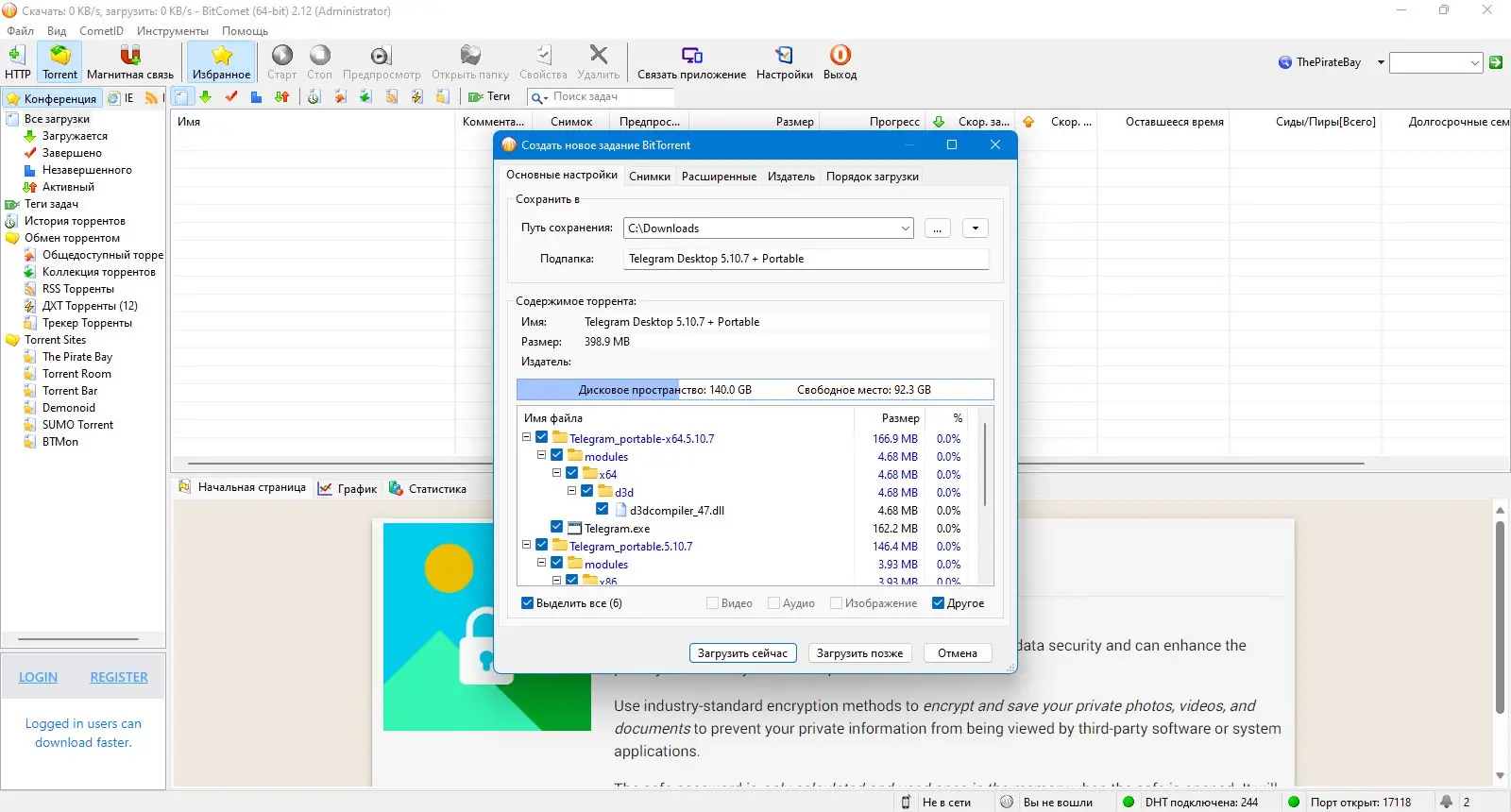 Данная программа позволяет легко скачивать файлы через торрент или Magnet-ссылки, обладает высокой скоростью загрузки и гибкими настройками. Она поддерживает одновременное скачивание нескольких файлов с приоритетами, создание очередей и автоматическую оптимизацию соединения. Благодаря встроенной поддержке прокси-серверов, DHT, обмену пирами и другим современным технологиям, BitComet обеспечивает стабильную работу в различных условиях. Хоть программа и работает на Windows 7, 8/8.1, 10 и 11, пользователи с х32 и х64 системами смогут без проблем скачать её и настроить для своих целей.