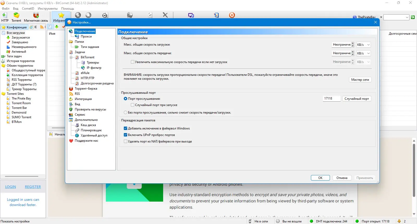 Обратите внимание, что при работе через торрент или Magnet-ссылки порт может быть заблокирован или нуждаться в ручной настройке для корректной работы.