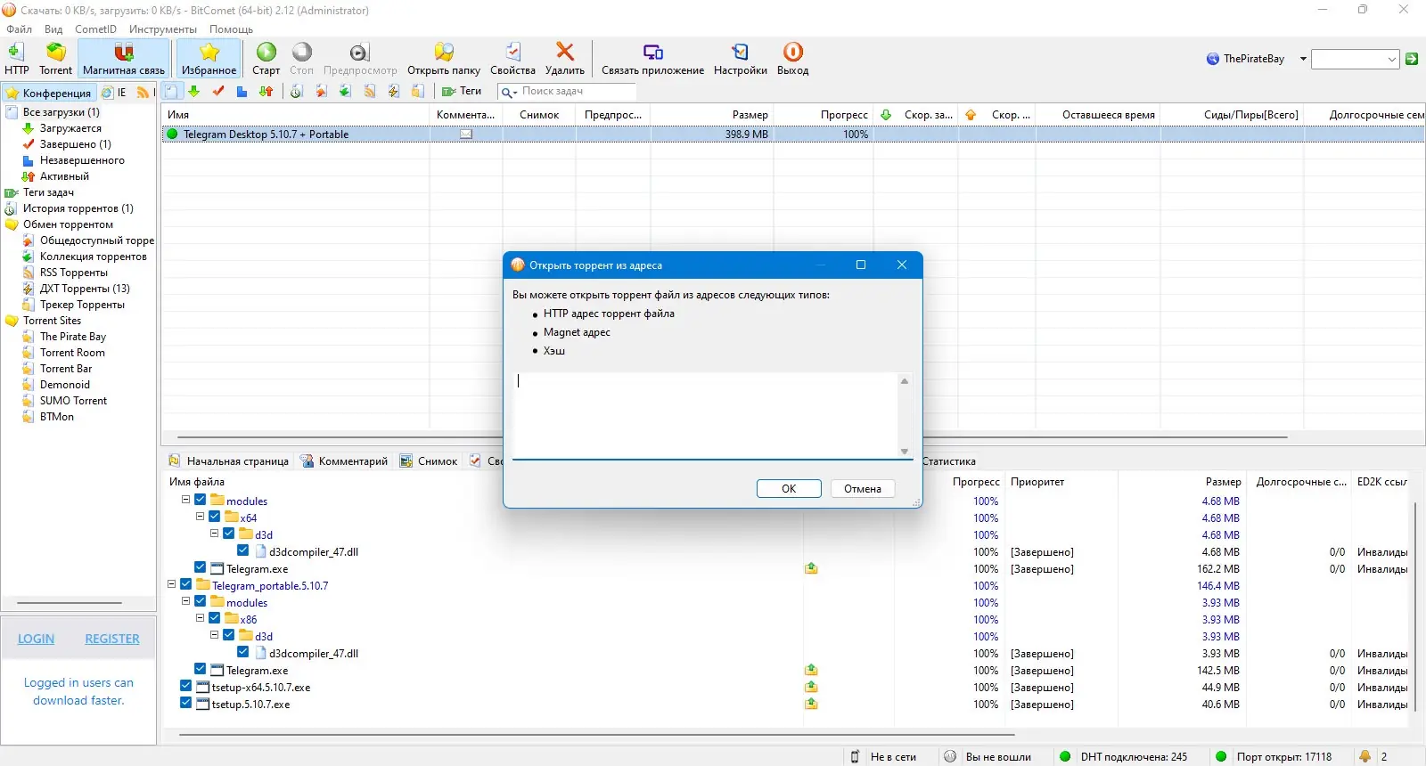 - Работа с торрентами и Magnet-ссылками, поддержка DHT и обмена пирами