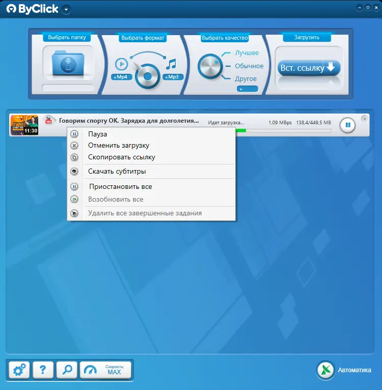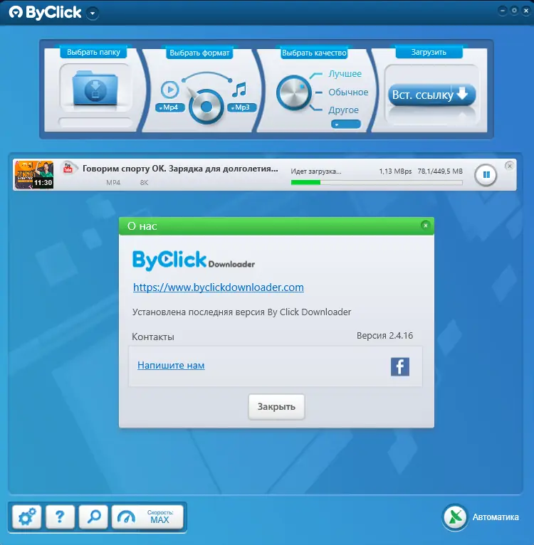 By Click Downloader — это многофункциональный загрузчик видео, предназначенный для удобного и быстрого скачивания роликов с популярных интернет-порталов, таких как YouTube, Vimeo, Facebook, Dailymotion и другие. Приложение обладает понятным интерфейсом, позволяет сохранять видео в различных форматах и качестве, а также поддерживает скачивание целых плейлистов и каналов. Благодаря автоматическим уведомлениям и интеграции с браузером, процесс загрузки становится максимально простым и комфортным для пользователя. Независимо от операционной системы Windows 7, 8/8.1, 10 или 11, вы сможете бесплатно получить максимум возможностей этого программного продукта.