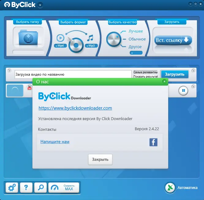 By Click Downloader — это удобное решение для загрузки видеоматериалов из YouTube и других популярных ресурсов. Приложение поддерживает различные форматы и качество, обеспечивает быструю работу и простоту использования.