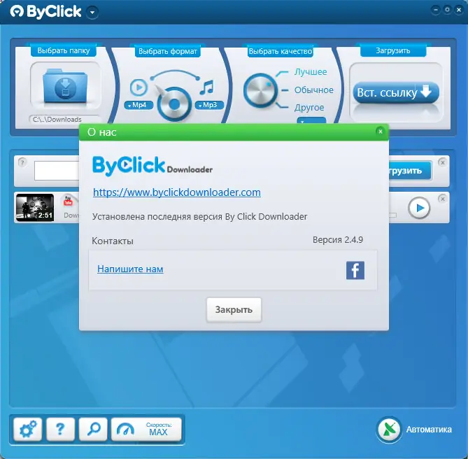 By Click Downloader (ранее известный как YouTube By Click) — удобный и многофункциональный загрузчик видеороликов с YouTube и других популярных платформ. Благодаря простому интерфейсу и автоматизации процесса скачивания, программа позволяет быстро сохранять видео и аудио файлы, поддерживая скачивание с Facebook, Vimeo, Dailymotion и других ресурсов. Основная особенность — автоматическое всплывающее окно, которое идеально подходит для быстрого получения контента прямо из браузера. Для скачивания необходимо скопировать ссылку на интересующее видео, выбрать папку для сохранения, формат и качество, а затем нажать кнопку “Вставить URL”. Множество популярных браузеров — Chrome, FireFox, IE и Edge — поддерживают данное приложение, что обеспечивает абсолютную совместимость и удобство использования.