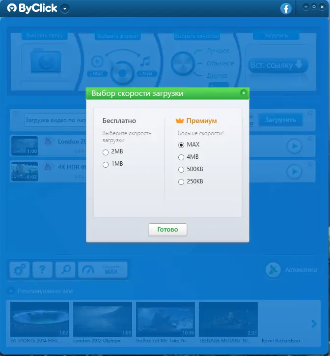 ByClick Downloader — это мощный загрузчик видео, который помогает быстро сохранять ролики с различных платформ. Для получения нужного видеоматериала достаточно скопировать его URL-адрес, выбрать папку для сохранения, желаемый формат и качество, После этого нажать кнопку «Вставить URL», и начнется автоматическая загрузка. Поддержка скачивания целых плейлистов, конвертация файлов в множество популярных форматов, а также возможность экспортировать видео из YouTube в iTunes делают программу универсальным решением для любителей видео-контента.