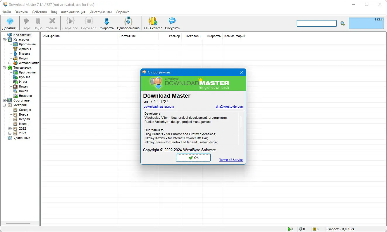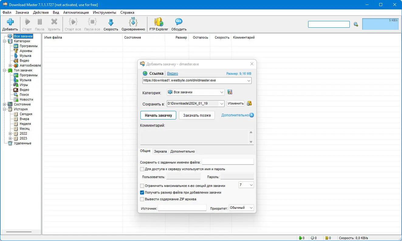 Download Master эффективно решает три главных проблемы при закачке файлов: увеличение скорости закачки за счет многопоточной разбивки файла, возможность продолжения прерванных загрузок и удобное управление скачанными файлами. Высокая эффективность работы достигается благодаря использованию технологии многопоточной загрузки с динамическим распределением секций, что увеличивает скорость загрузки в 3-10 раз. Программа обладает интуитивным интерфейсом и множеством настроек, позволяющих адаптировать работу под любые типы соединений – от dial-up до ADSL и LAN. Она поддерживает работу через HTTP, HTTPS, FTP протоколы, работу с прокси-серверами, а также с ZIP и RAR архивами, предоставляя пользователю расширенные возможности по их просмотру и управлению содержимым. Возможности интеграции с веб-браузерами, управление скоростью и приоритетами закачек делают этот инструмент максимально удобным для широкого круга пользователей, будь то профессионалы или обычные пользователи.