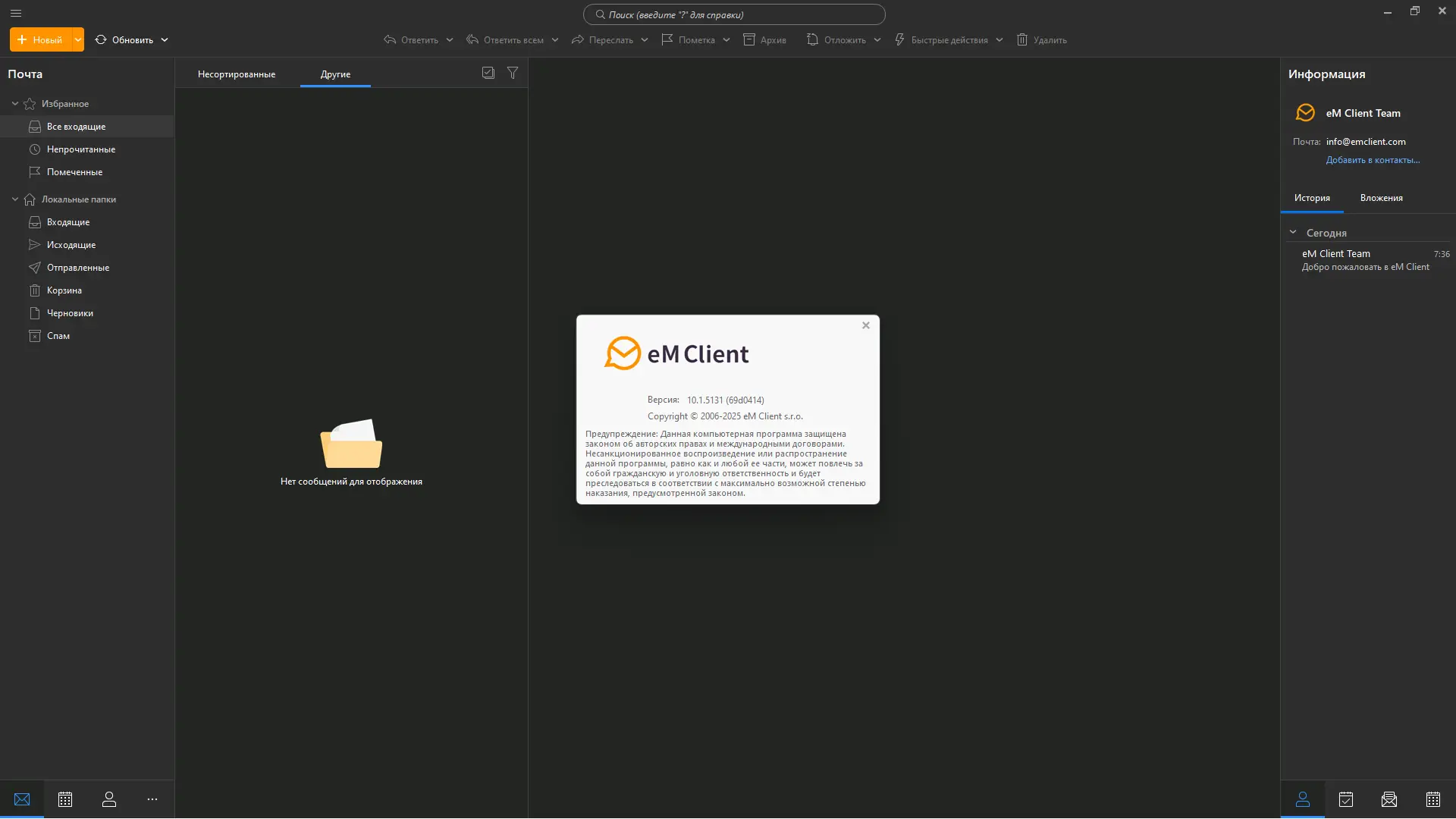 eM Client — это универсальный почтовый клиент, предлагающий широкие возможности для работы с электронной почтой и коммуникациями. Он обеспечивает прием, отправку, чтение и управление письмами, а также поддерживает интеграцию с множеством популярных интернет-сервисов. В дополнение к основному функционалу, программа включает замечательный мультифункциональный органайзер с встроенной адресной книгой, планировщиком задач и календарем с напоминаниями. Встроенный чат-мессенджер позволяет быстро обмениваться сообщениями, а возможность импорта данных из сторонних приложений повышает удобство пользования.