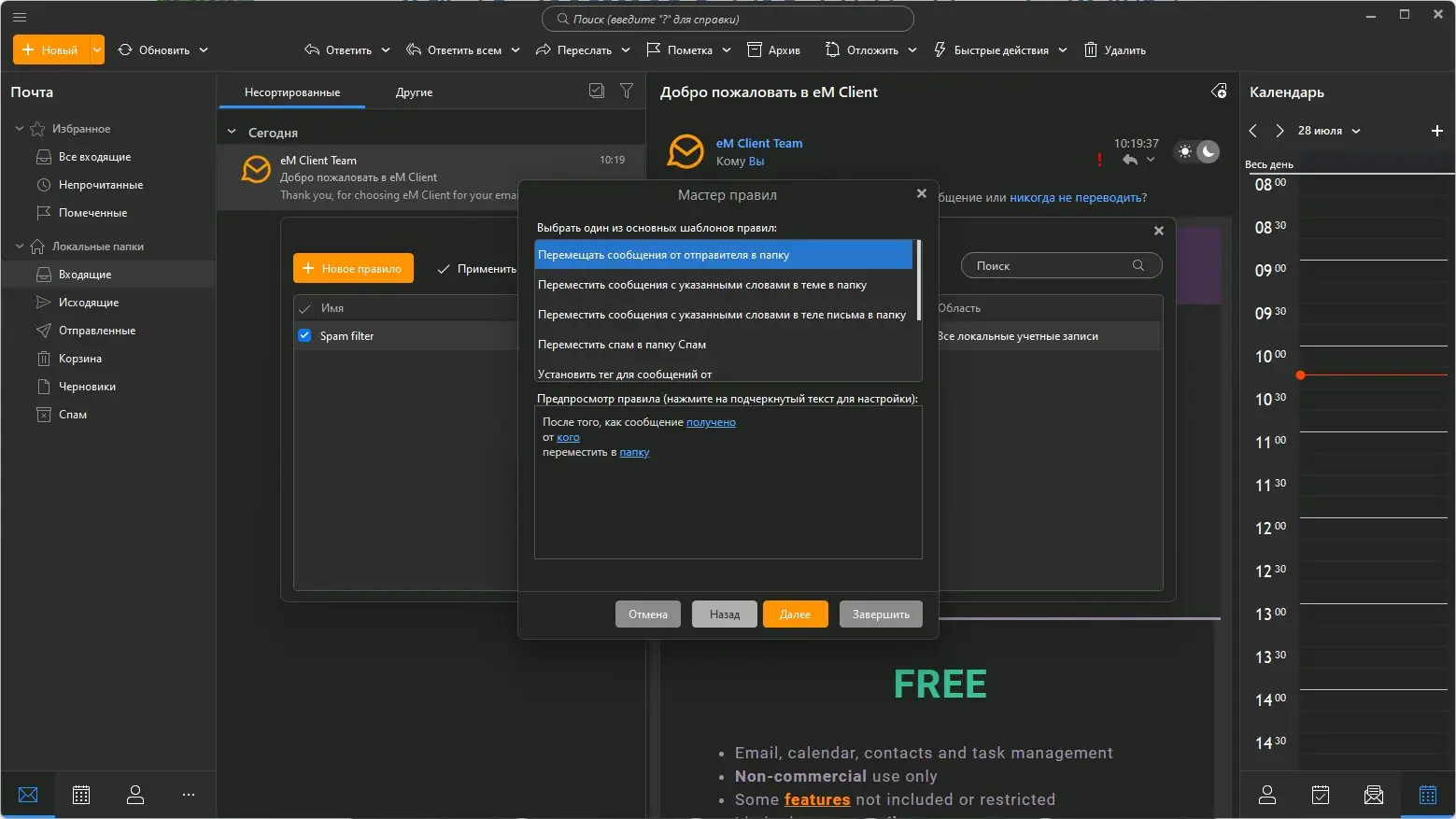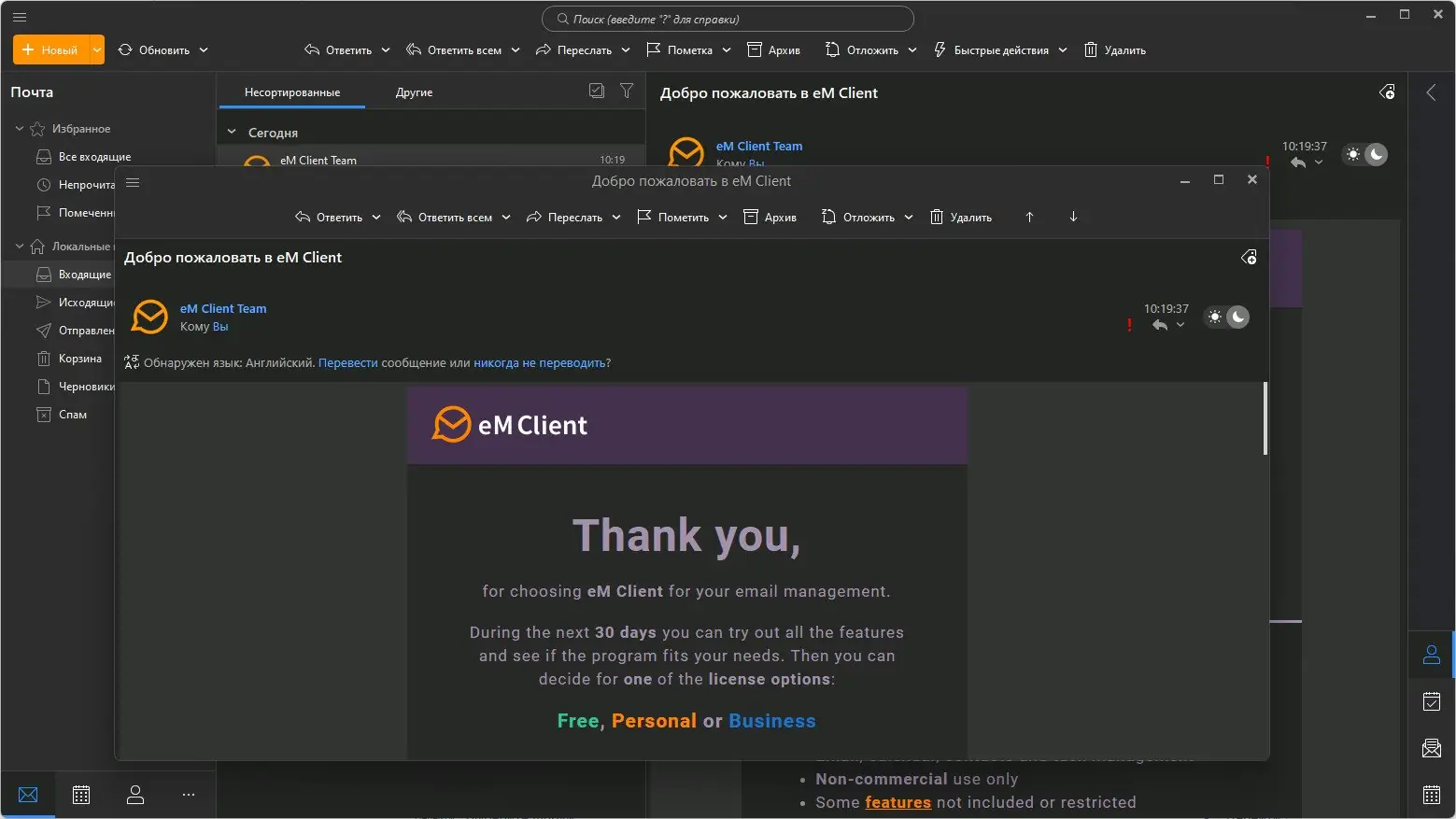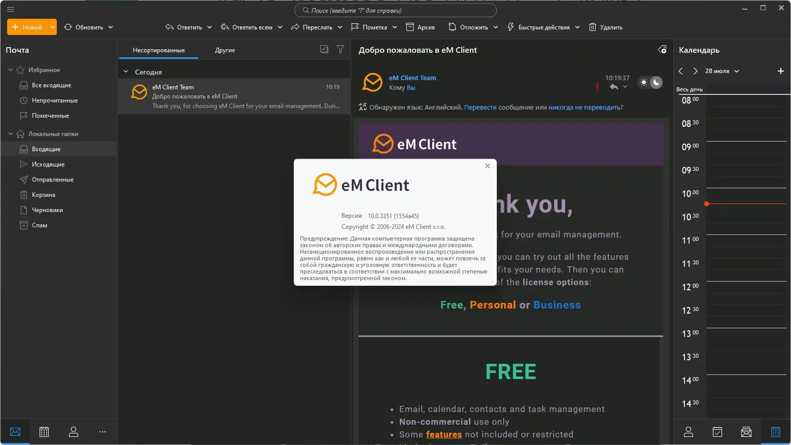 eM Client — это универсальное решение для работы с электронной почтой, которое обеспечивает не только прием, отправку и чтение писем, но и включает такие полезные инструменты, как встроенный календарь, контактная книга, планировщик задач и органайзер. Программа поддерживает работу с популярными почтовыми протоколами (POP3, IMAP, SMTP, EWS) и интегрируется со многими интернет-сервисами, включая Gmail, Outlook.com, Yahoo, iCloud и бизнес-сервисы. Большое внимание уделено удобству интерфейса, русификации и возможности персонализации через смену тем оформления. Благодаря функциям импорта данных из сторонних почтовых клиентов и поддержке привычных форматов, процесс настройки и перехода становится максимально простым и быстрым. Использовать программу можно на системах Windows 7, 8/8.1, 10 и 11 как на 32-, так и на 64-битных версиях, а также в портативном режиме.