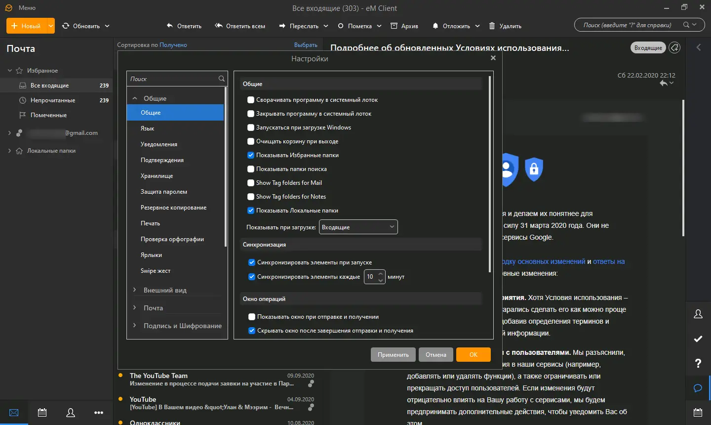- Настроить учетные записи, параметры синхронизации и импорт данных при помощи настроек программы.