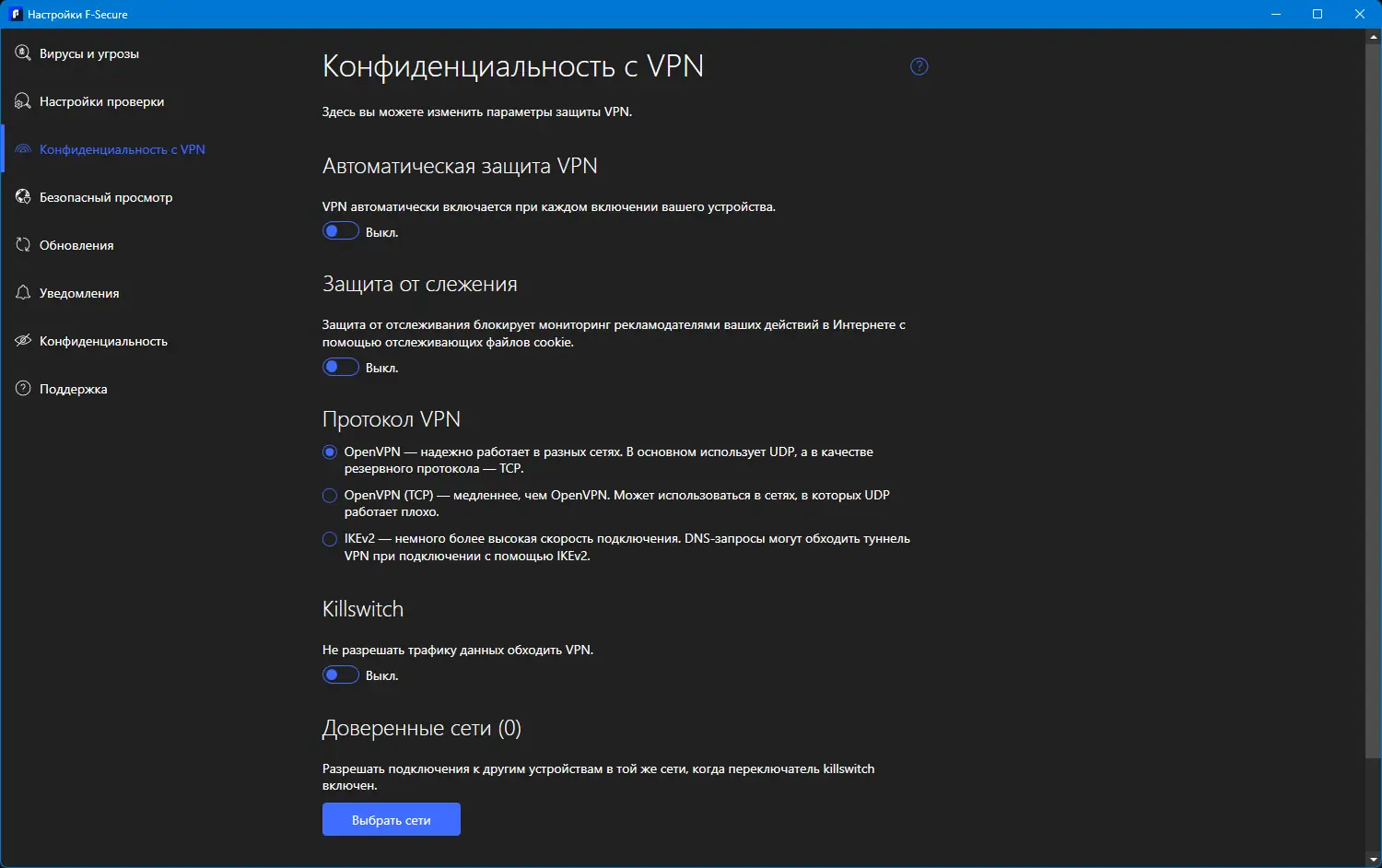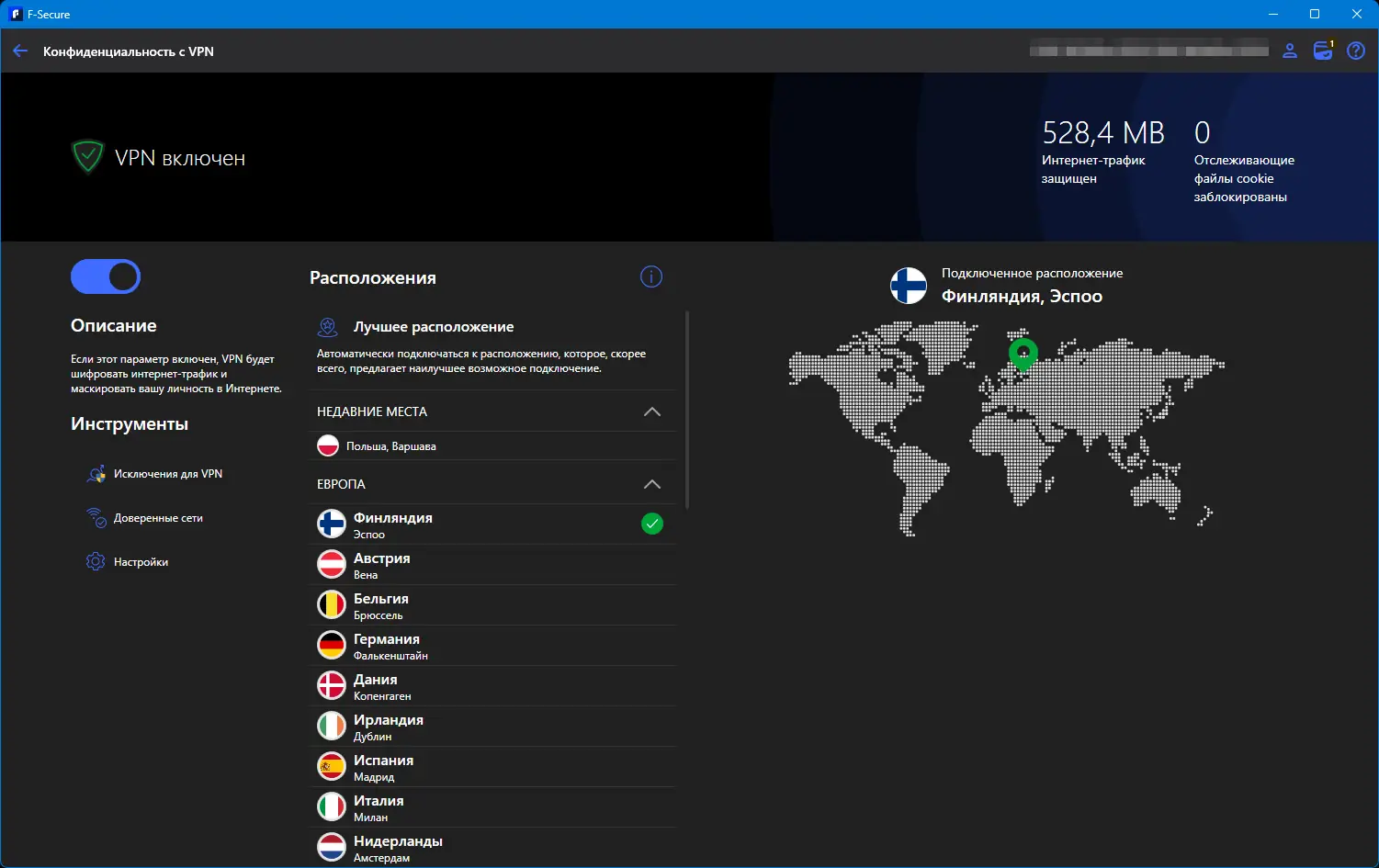 F‑Secure VPN — это современное решение для обеспечения безопасности и конфиденциальности в Интернете, разработанное более 30 лет в области кибербезопасности. Программа позволяет пользователям безопасно просматривать сайты, скрывать свой IP-адрес и обходить географические ограничения. Благодаря автоматической защите Wi-Fi и шифрованию соединения она делает интернет-серфинг приватным и защищенным, особенно при использовании общедоступных сетей. Легкая установка и высокая надежность позволяют использовать F‑Secure VPN на различных устройствах и платформах.