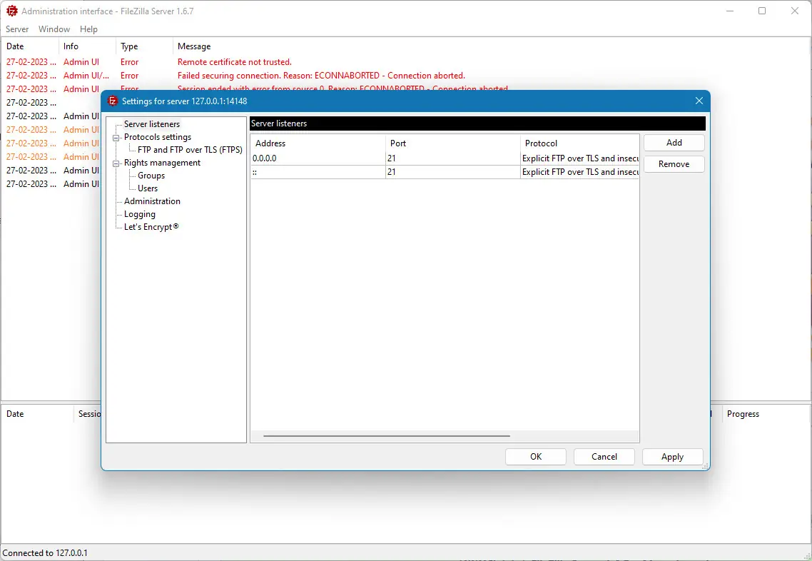 FileZilla Server представляет собой очень простой, но в то же время достаточно функциональный FTP-сервер. Он работает на базе протоколов FTP, SFTP и FTPS, обеспечивает неограниченное число подключений и пользователей, а также поддерживает работу в фоновом режиме в виде службы. Интуитивно понятный графический интерфейс делает настройку и администрирование максимально удобными. Для повышения безопасности предусмотрены автоматические системы защиты от внешних атак и подбора паролей.