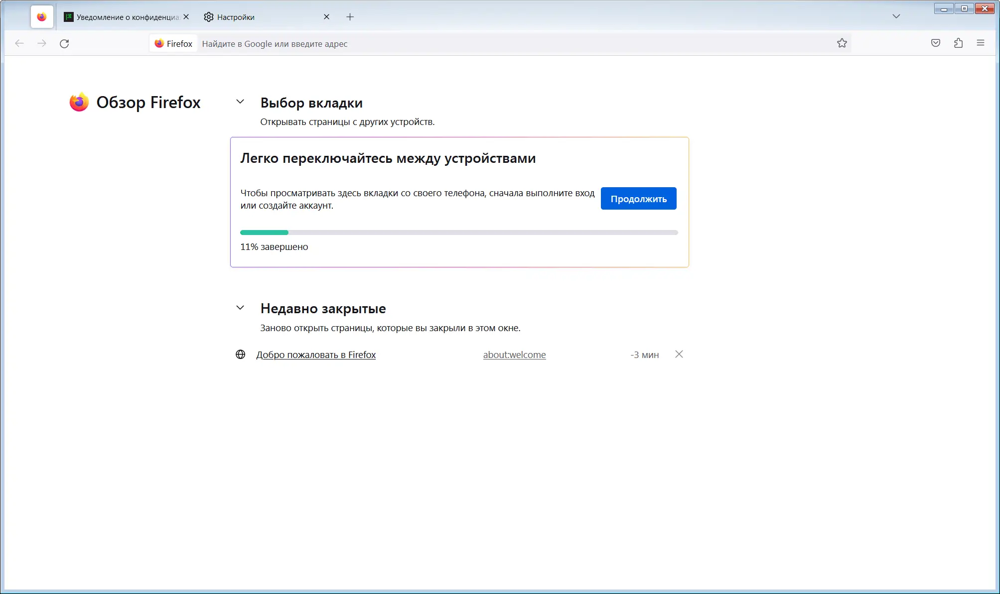 - Завершите установку и запустите браузер для первичной настройки и обновления