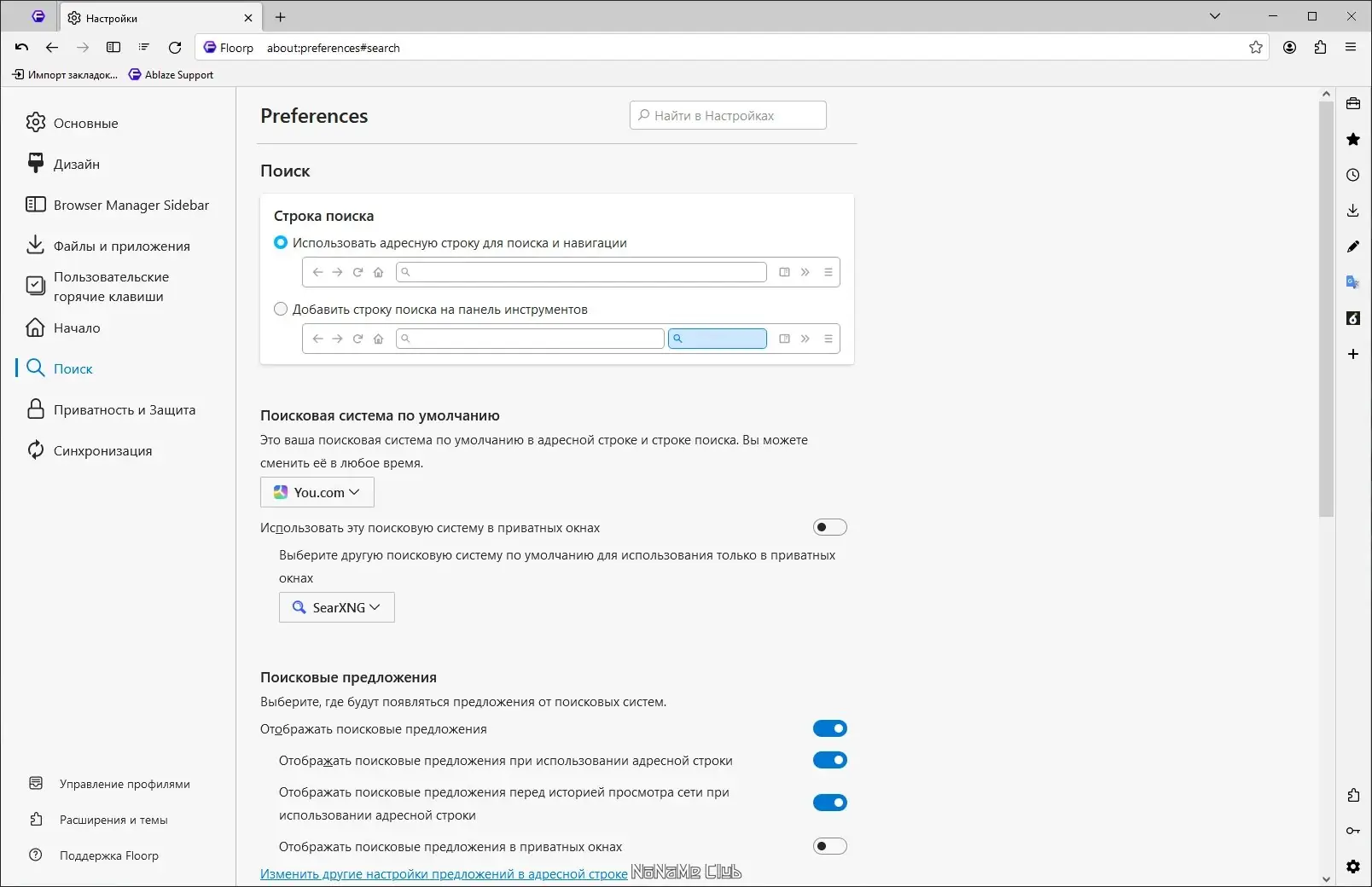 - Управление поисковыми системами, установка второго приватного поисковика.