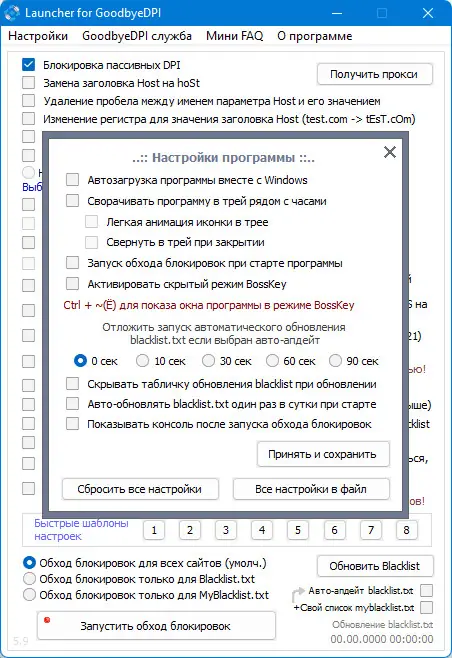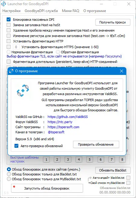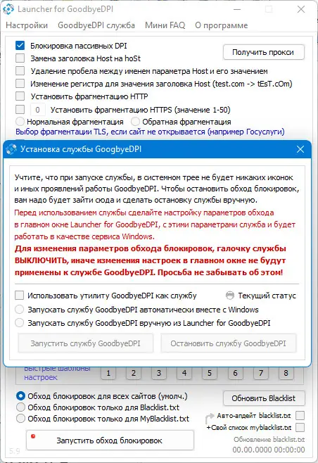 - Запуск утилиты GoodbyeDPI с графическим интерфейсом через удобный лаунчер