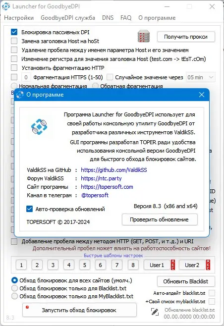 Дополнительно имеется функция автоматического обновления блеклиста, встроенная проверка целостности файлов, а также возможность добавлять свои собственные адреса в отдельный файл myblacklist.txt, что позволяет пользователю настраивать список сайтов для обхода самостоятельно.