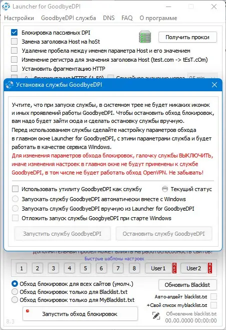 Программа отличается высокой стабильностью, эффективностью и простотой настройки. Она написана программистом ValdikSS и включает мощные инструменты для обхода блокировок по IP-адресу и системам DPI. В комплект входит лаунчер GoodbyeDPILauncher, обеспечивающий интуитивный интерфейс, а при необходимости утилита может работать полностью автономно, как служба. Основные преимущества — отказ от обращения к сторонним серверам, отсутствие ограничения скорости и использование только локальных ресурсов.