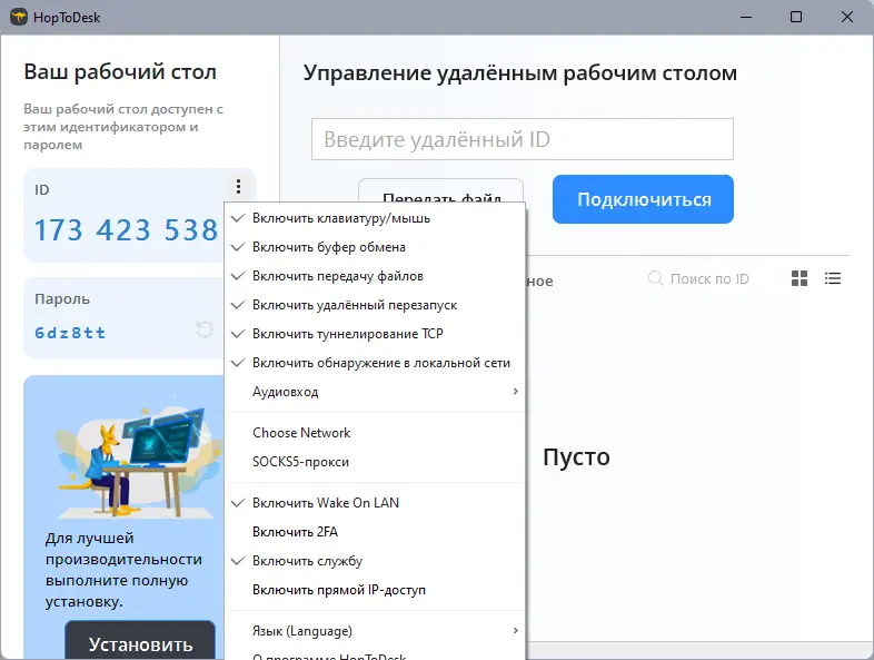 HopToDesk — это бесплатное решение для удаленного управления компьютерами и демонстрации экрана, предназначенное для профессионального использования и личных нужд. Оно обеспечивает безопасное и простое подключение без необходимости настройки сложных параметров сети.