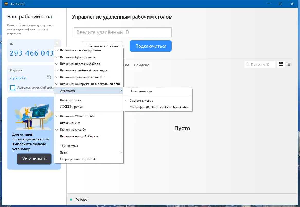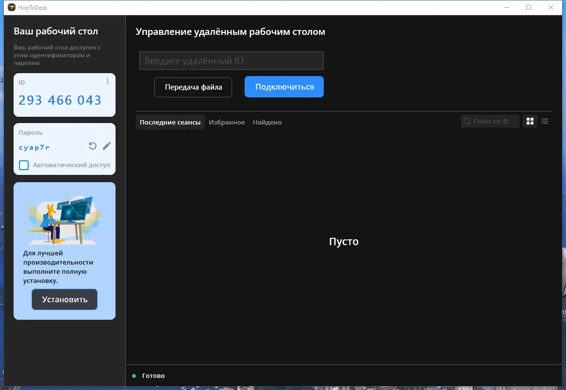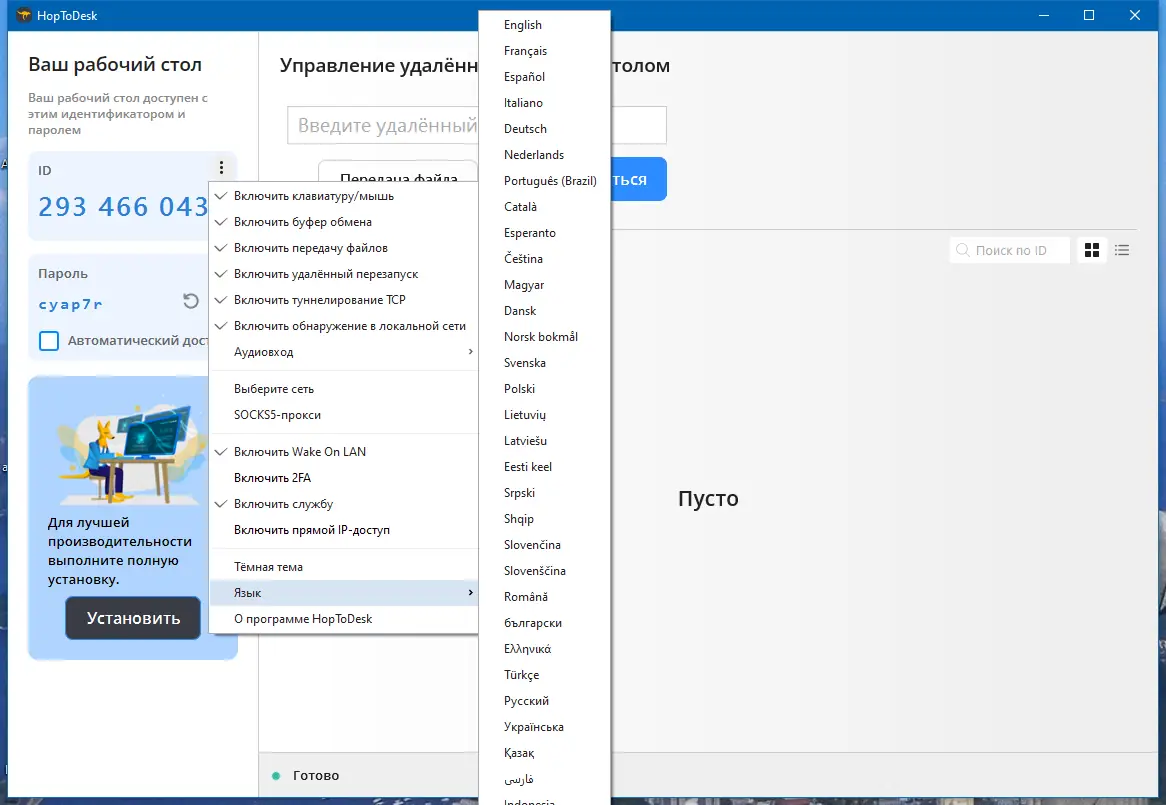 HopToDesk — это бесплатный и открытый инструмент для удаленного управления компьютерами и демонстрации экрана. Он предназначен для быстрой и надежной поддержки, совместного использования рабочих сессий и передачи файлов между удаленными устройствами.