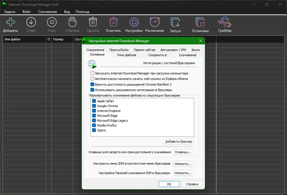 - Автоматическая интеграция с браузерами (Chrome, Firefox, Opera, IE) для перехвата загрузок.
