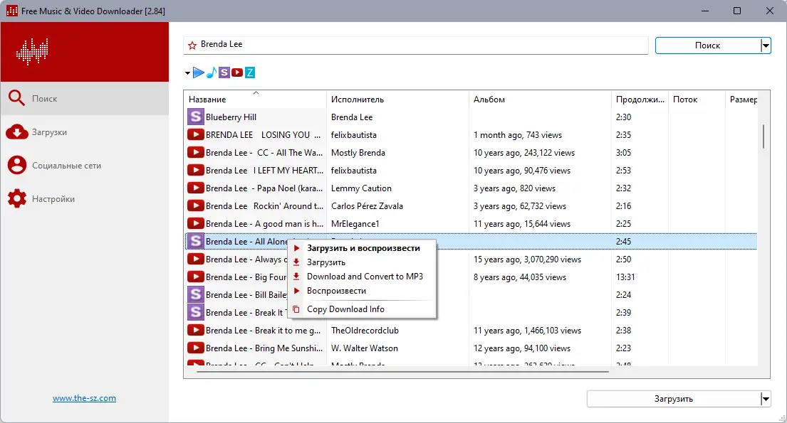 Эта программа создана для тех, кто хочет иметь быстрый и простой доступ к любимой музыке и видеоматериалам без лишних сложностей. Интерфейс Lacey — минималистичный и интуитивно понятный, что позволяет без затруднений осуществлять поиск через основные популярные ресурсы. В базе программы около сорока сайтов, включающих как легальные источники, так и пиратские ресурсы. Пользователь может расширить список ресурсов, кликнув по треугольнику рядом со значками сайтов и выбрав дополнительные площадки для поиска. Помимо скачивания, приложение поддерживает воспроизведение медиа в встроенном плеере, конвертацию видео в MP3, а также интеграцию с Mail.ru и ВКонтакте, что удобно для организации и прослушивания контента в одном месте.