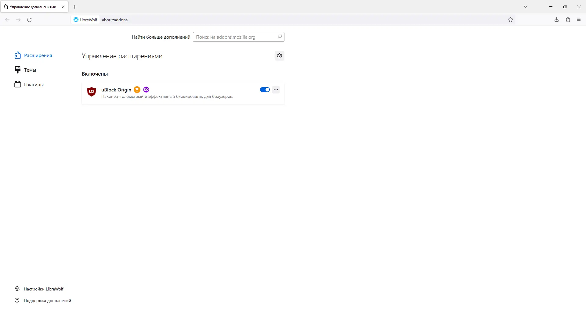 - Встроенный uBlock Origin для блокировки рекламы и скриптов.