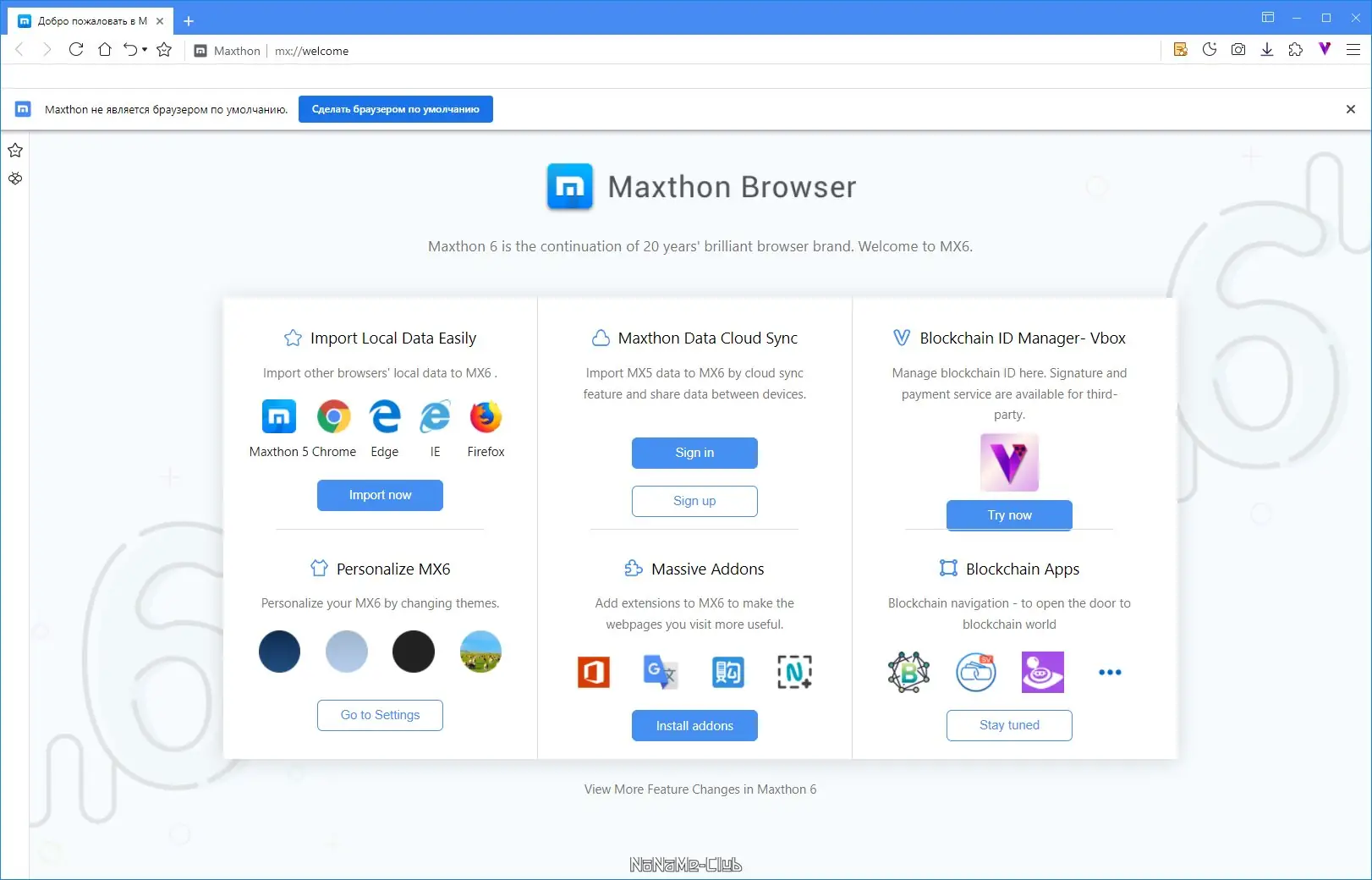 Новая версия Maxthon 6 разработана как полнофункциональный браузер, объединяющий уникальные особенности своего предшественника и открытый исходный код Chromium. Это первый шаг к нового типа Интернета — Метанету, где безопасность и удобство использования стоят на первом месте. Программа предоставляет широкие возможности для персонализации и защиты ваших данных, делая серфинг максимально комфортным и защищённым.