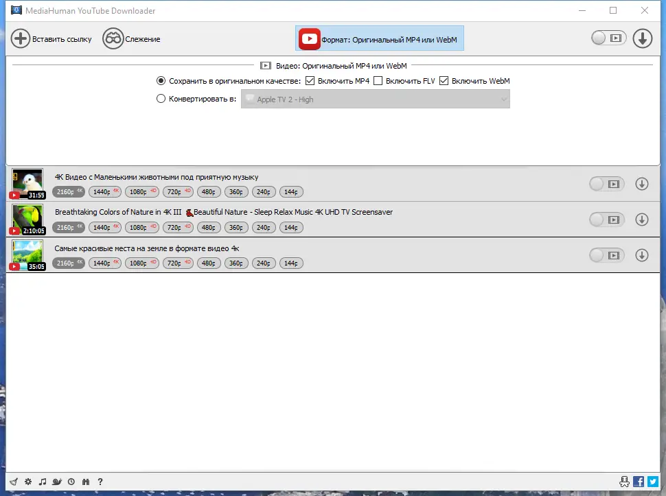 MediaHuman YouTube Downloader — это удобное и универсальное приложение для быстрого скачивания видео и аудио с популярных сервисов, таких как YouTube, Vimeo, Dailymotion и других. Поддержка множественных форматов и качеств позволяет сохранять контент в нужном виде для просмотра на любых устройствах.