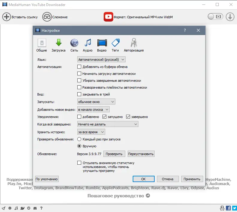 MediaHuman YouTube Downloader — это удобное приложение для быстрого и легкого скачивания видео и трейлеров с YouTube, Vimeo, Dailymotion, SoundCloud и других популярных платформ. Достаточно вставить ссылку, выбрать качество и формат файла, чтобы начать загрузку. Программа также автоматически отслеживает буфер обмена, что позволяет запускать загрузки в автоматическом режиме при копировании новой ссылки. Поддержка высокого разрешения до 8K и возможность скачивания целых плейлистов делают этот инструмент незаменимым для любителей качественного видеоконтента.